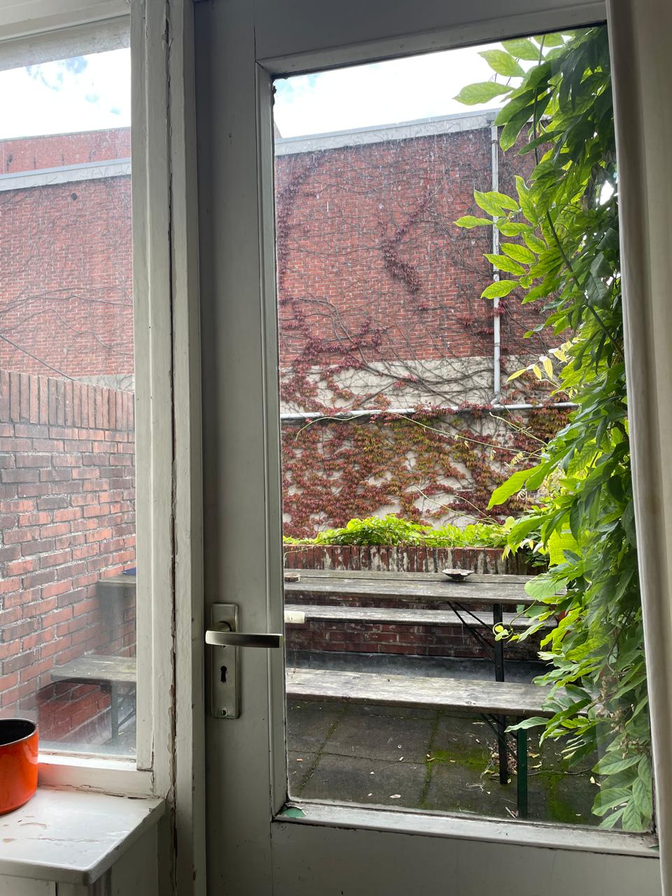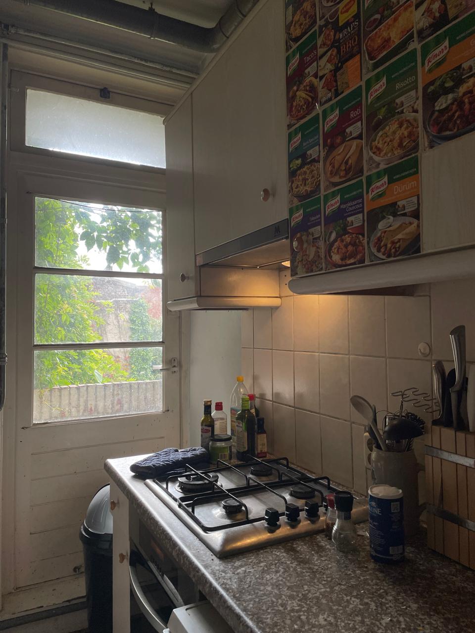 De kamer (ongemeubileerd) ligt op de eerste verdieping aan de straatkant en heeft een totale grootte van 12 m2. Een woonkamer (7m2), dakterras (8m2), de keuken en badkamer zijn gedeeld.