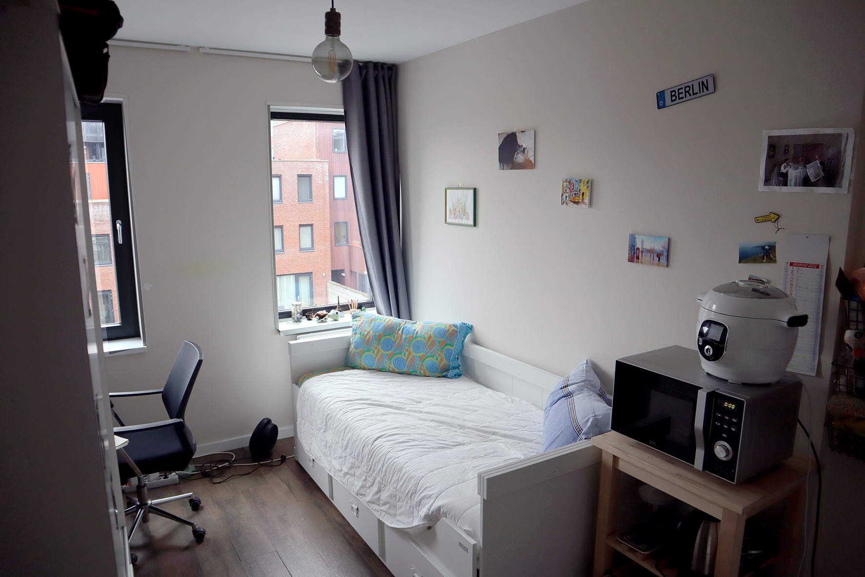 It is the second floor of the house. Location is very center of Hilversum (not Amsterdam), everything is in the walking distance. It is fully furnished, room has comfortable extendable bed (possible to make double bed), dark curtains, wardrobe, office desk and chair, book shelve. Kitchen has all equipment's included.