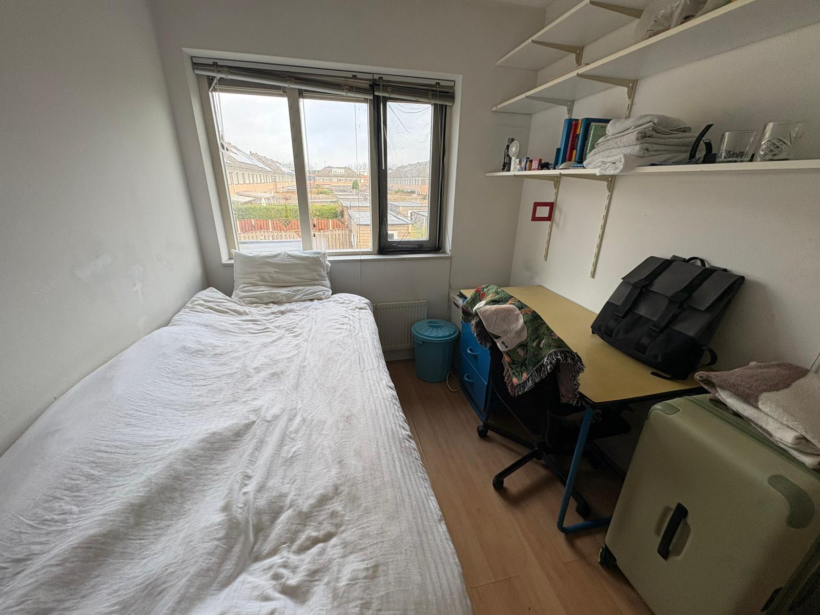 Gemeubileerde kamer, voorzien van bed, matras, buro, burostoel, kledingkast, boekenkasten, kabelinternet aansluiting.