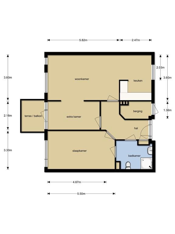 Vanuit de slaapkamer en vanuit de hal is er toegang tot de badkamer. Met ca. 8 m2 een ruime badkamer met toilet, wastafel en een douche.