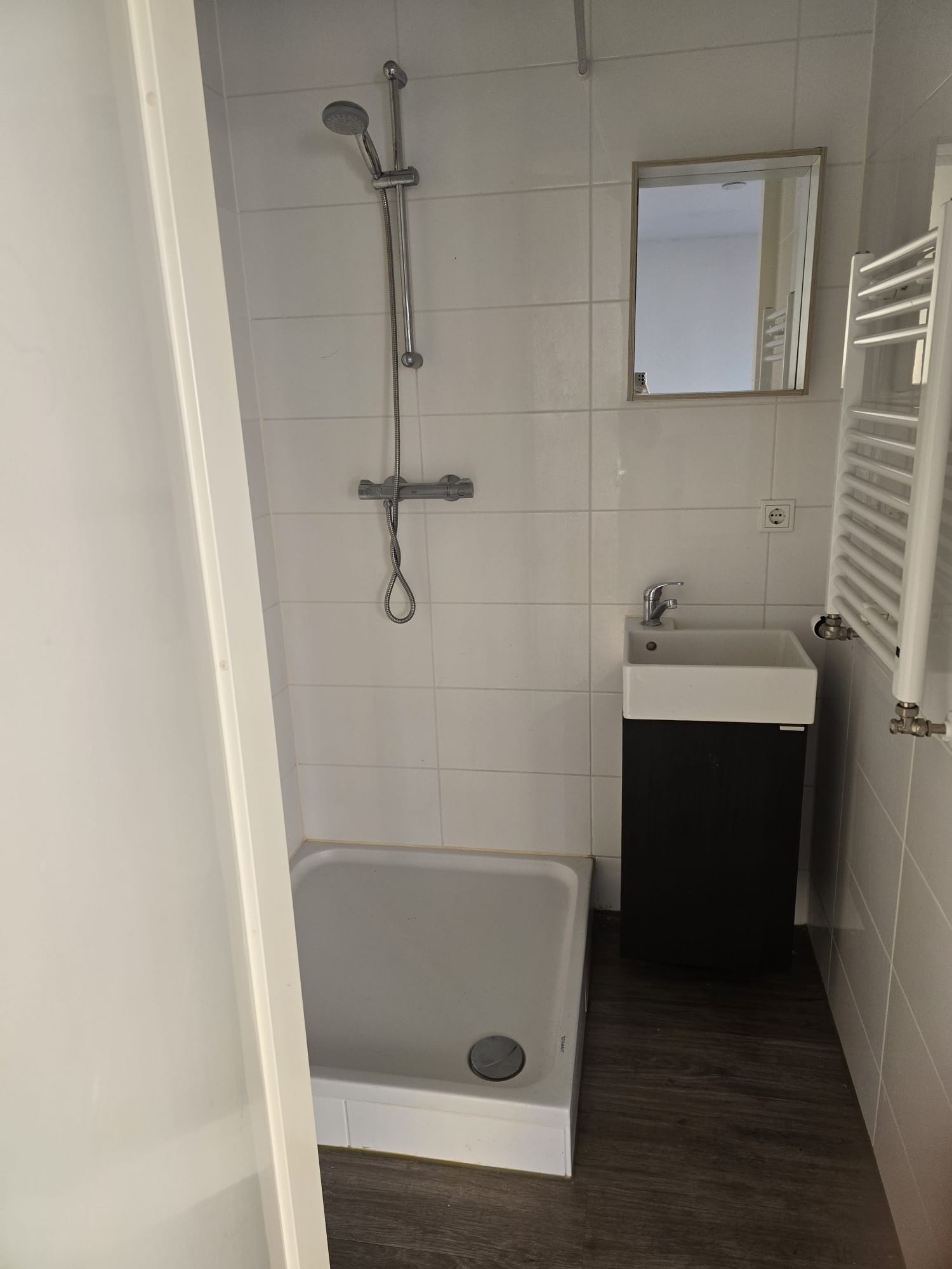 De woning beschikt over één slaapkamer en een nette badkamer met douche, wastafel en spiegel.