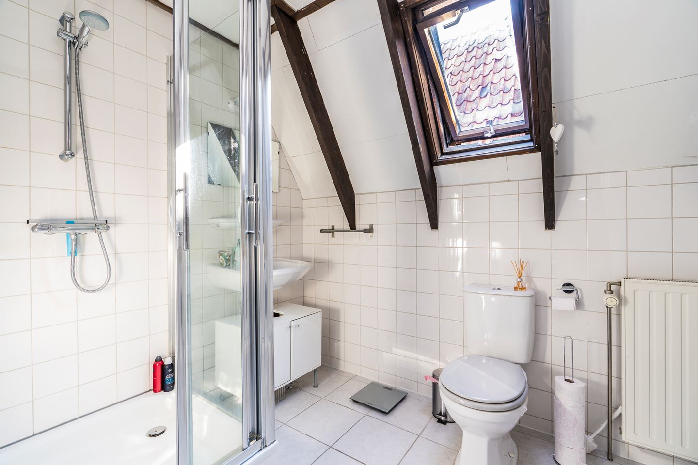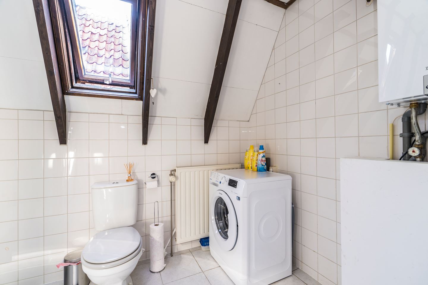 een badkamer voorzien van douche, toilet, vaste wastafel en wasmachine aansluiting.