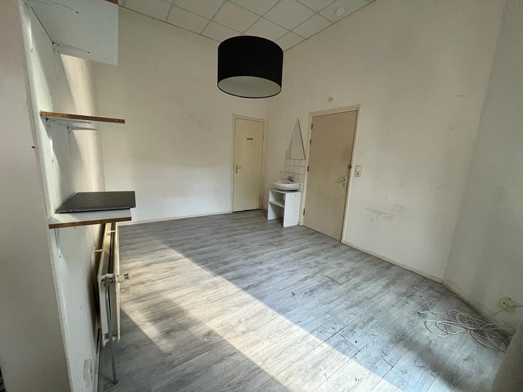 De studio bevindt zich op de eerste verdieping van een karakteristiek, monumentaal pand. Via de gemeenschappelijke entree neem je de trap naar boven. De woon-/slaapkamer is praktisch opgezet en meet circa 17 m².