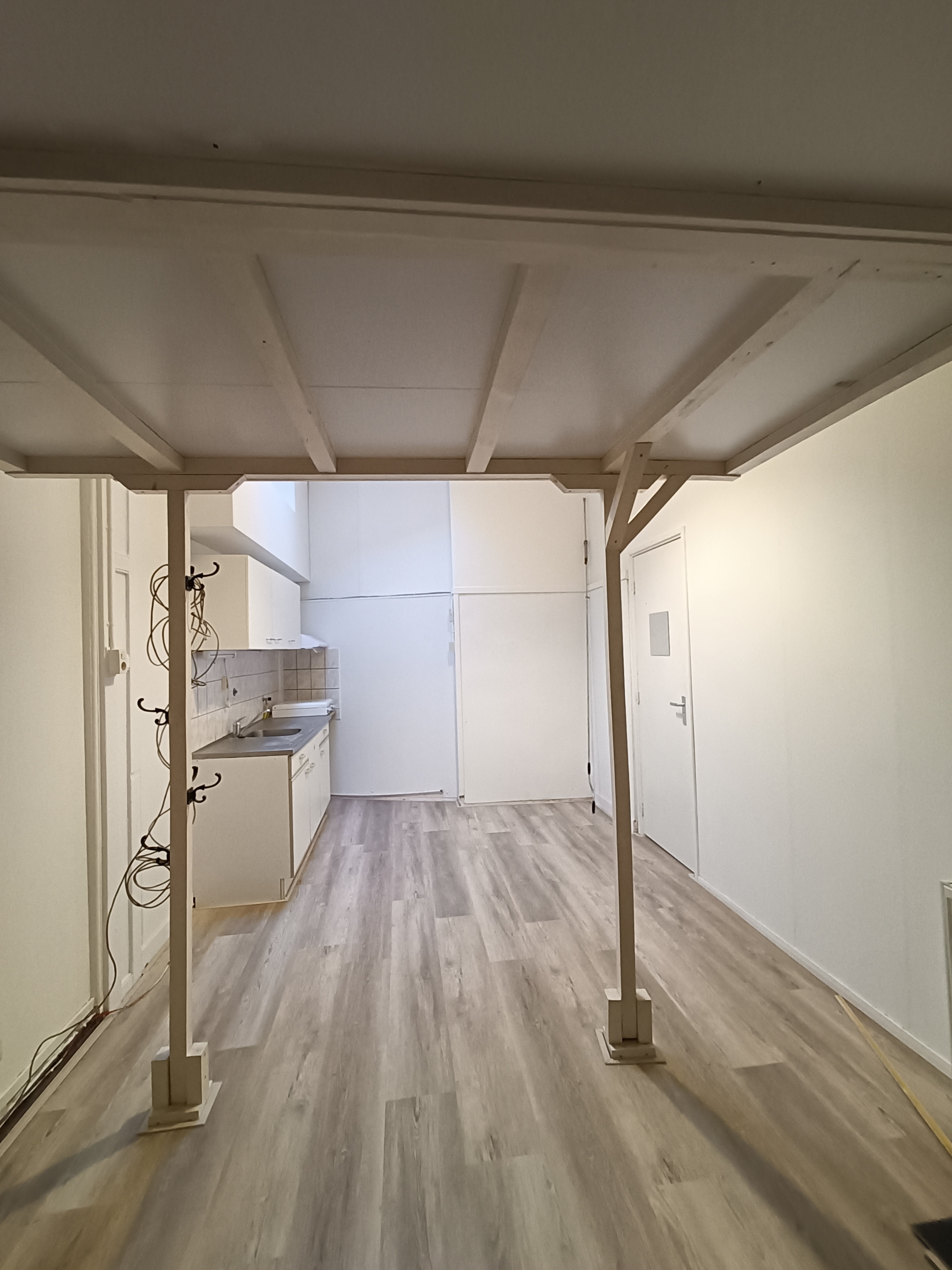 De betreffende woonruimte is gesitueerd op de begane grond aan de achterzijde van het pand. De woonkamer met open keuken is circa 17m2 groot en heeft veel lichtinval via de grote koepelramen op het dak. Er is een slaapvide aanwezig in de woonkamer voor een effectieve indeling van de ruimte.