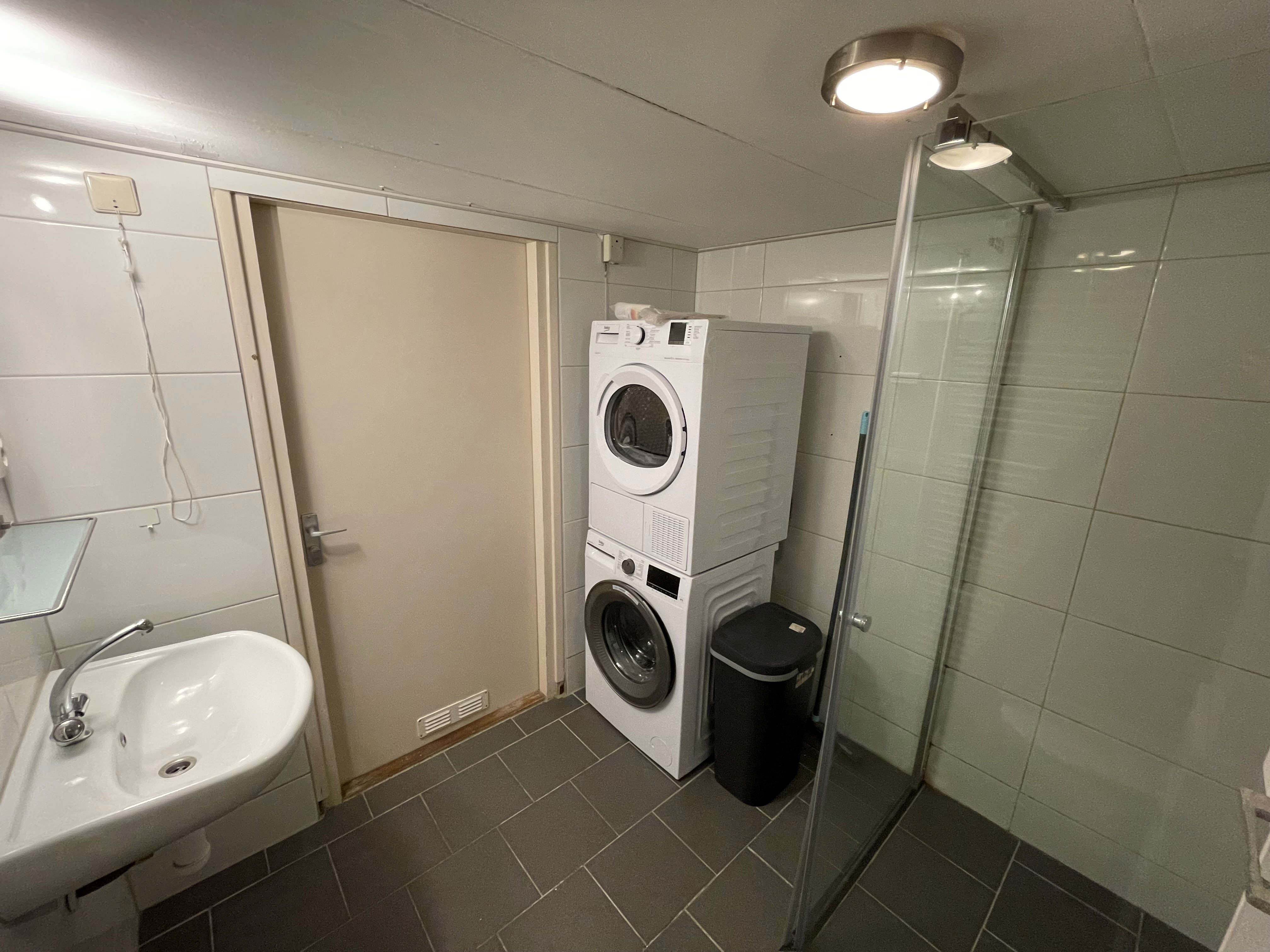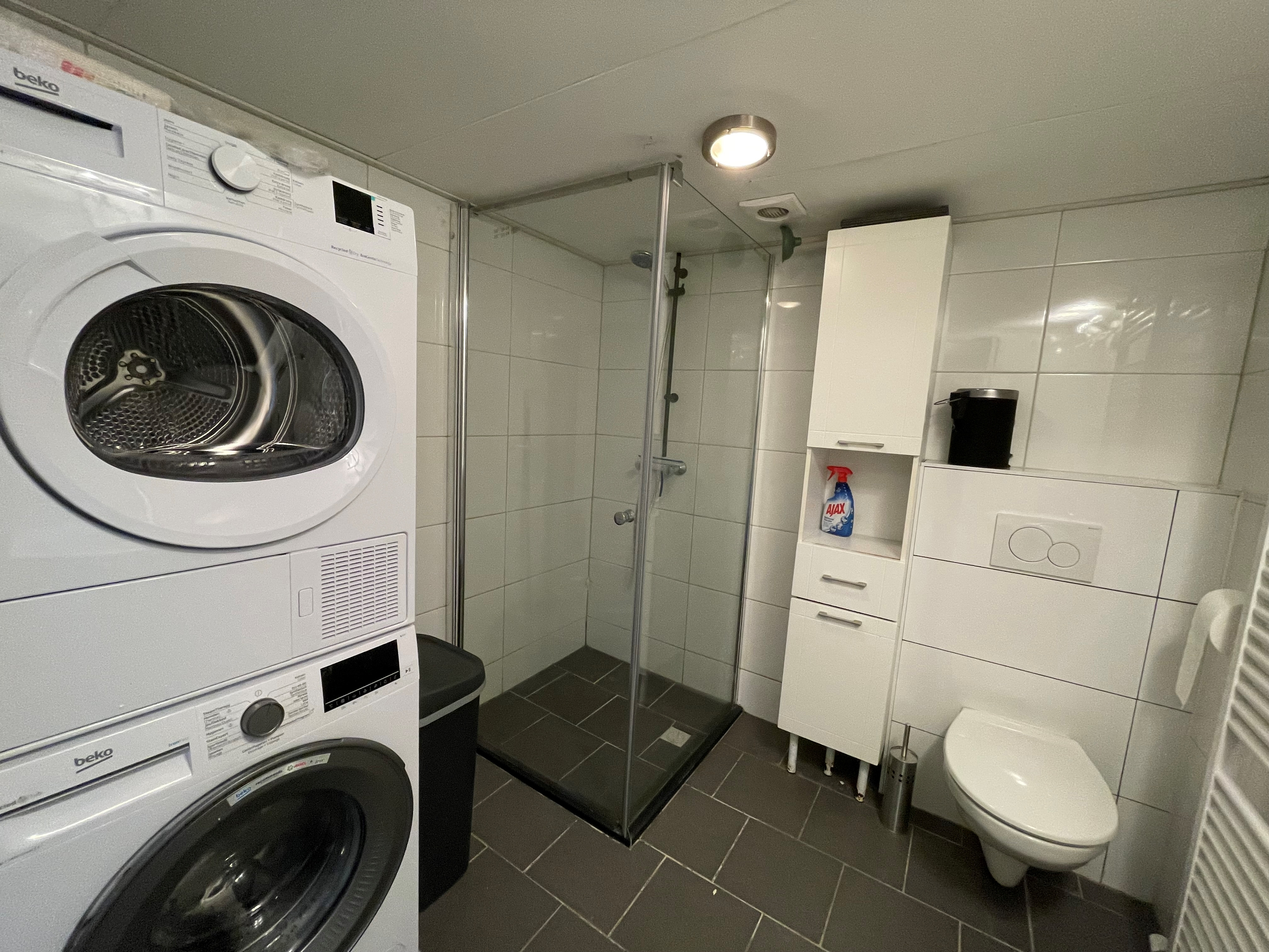 De begane grond deelt de keuken met zijn drieën. Deze is van alle gemakken voorzien zoals: vaatwasser, koelkast, vriezer, inductie kookplaat, afzuigkap en voldoende opbergruimte. De douche met handdoekradiator wordt ook gedeeld met zijn drieën. Verder beschikt het huis over een grote tuin (ca.