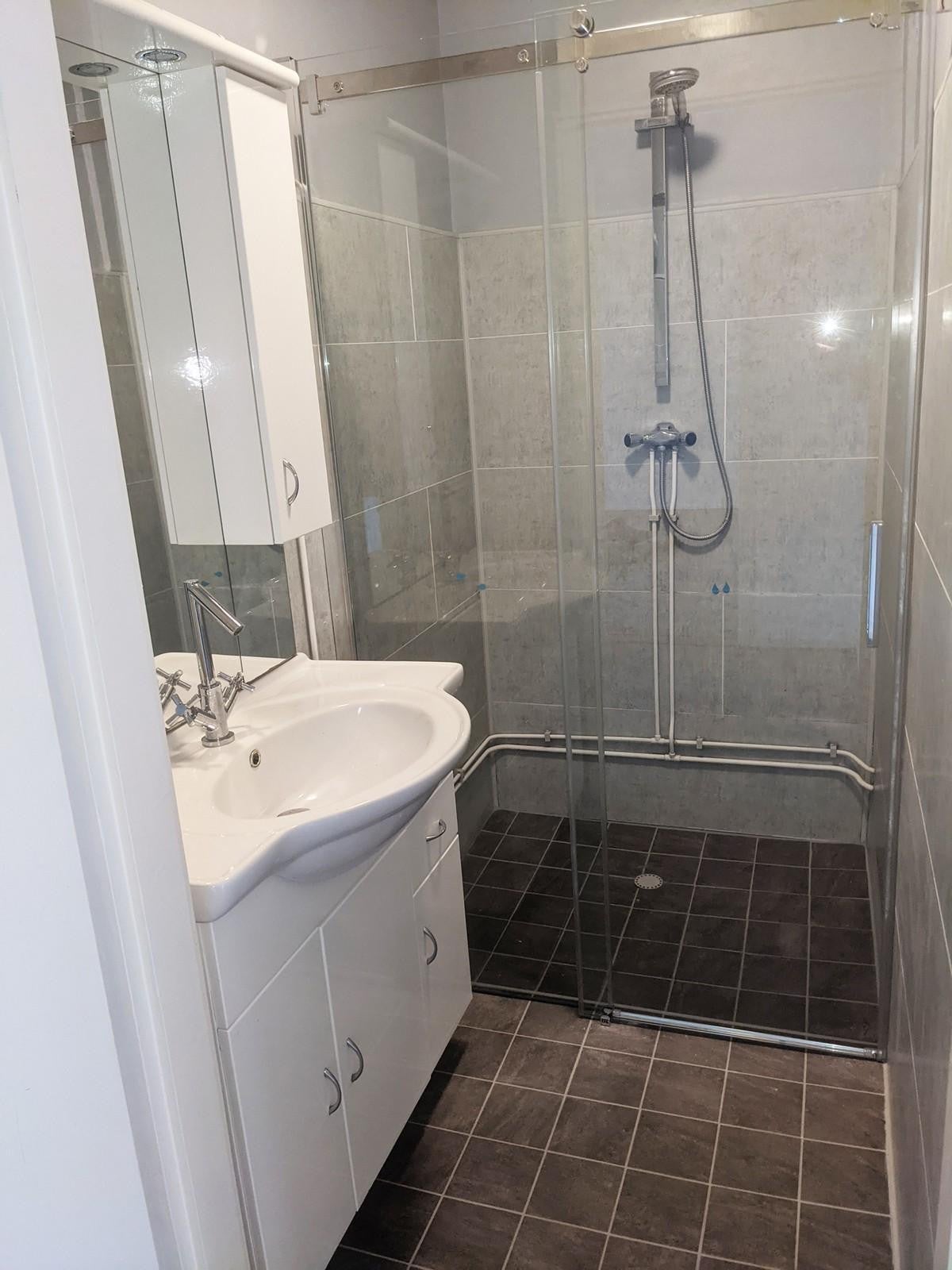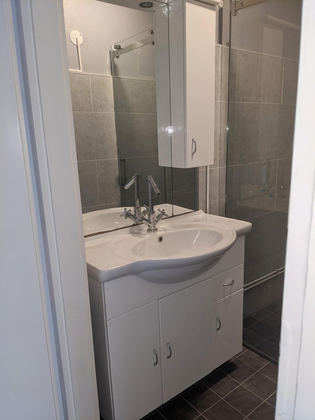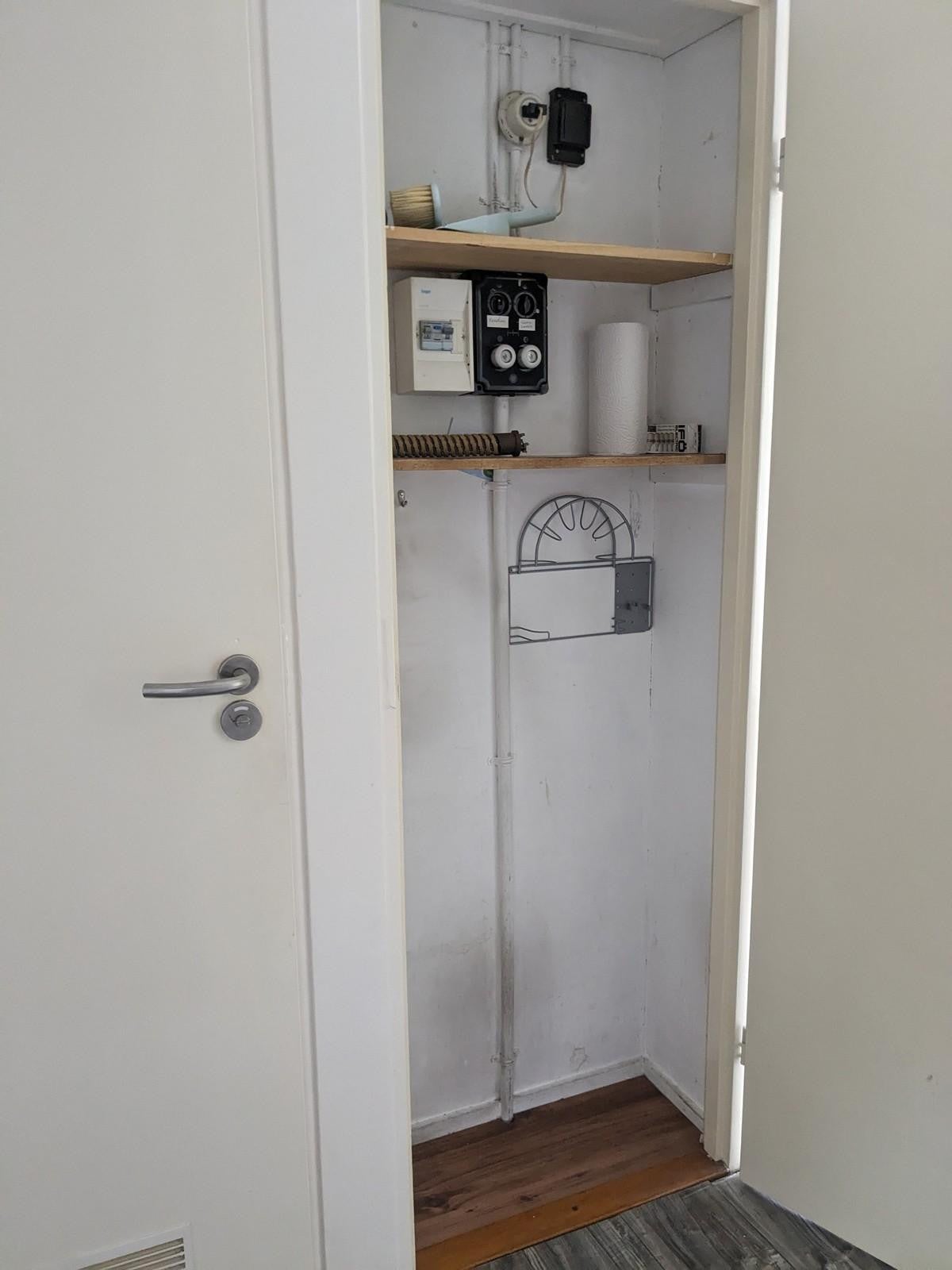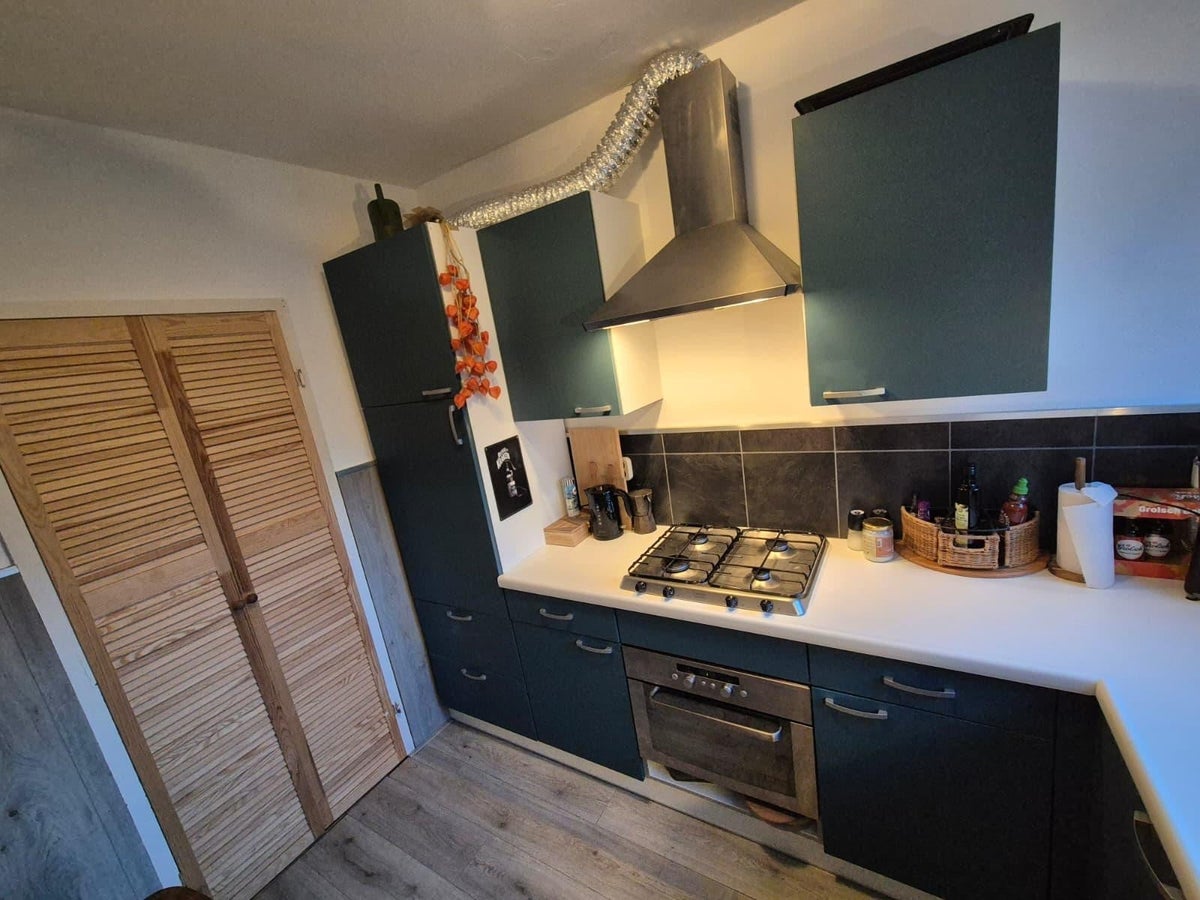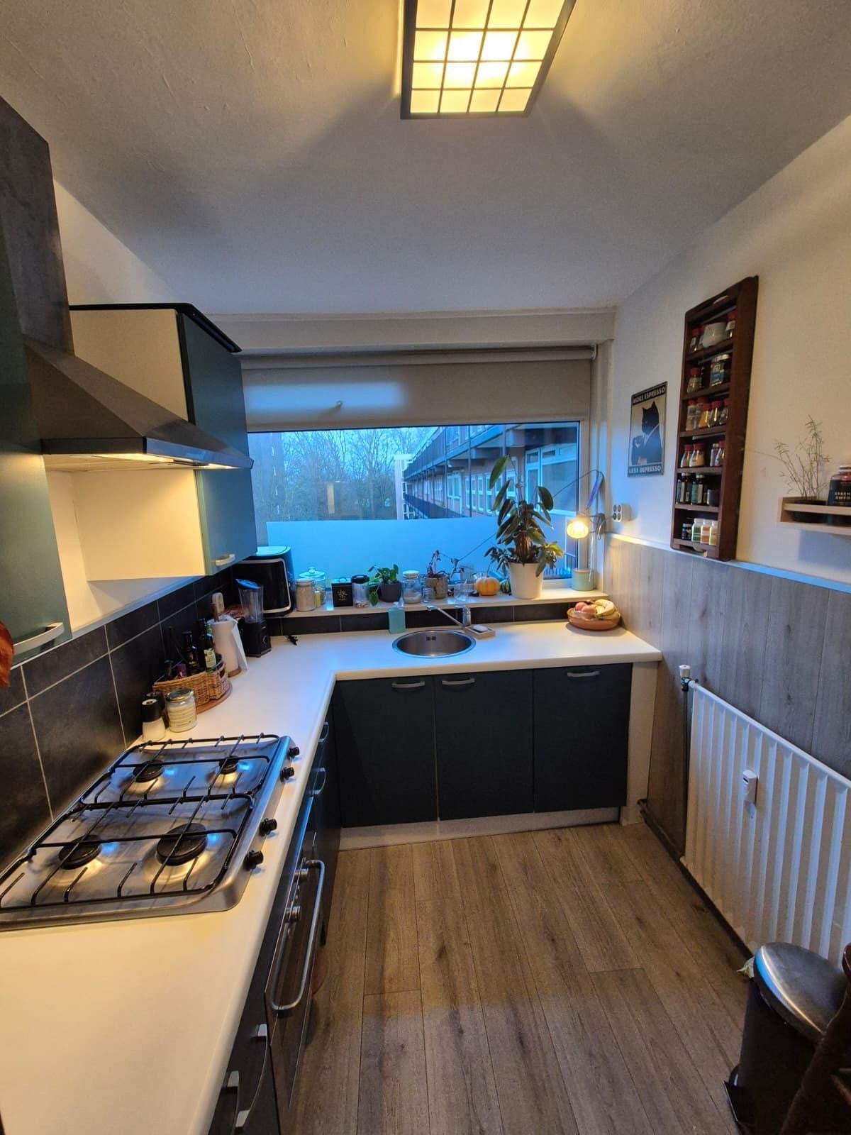De keuken heeft een verzorgde en moderne uitstraling. In de aangrenzende ruimte (met wasmachineaansluiting en boiler) zijn nette houten louvredeurtjes geplaatst, wat zorgt voor een strakke afwerking. De badkamer is goed onderhouden en functioneel ingericht.