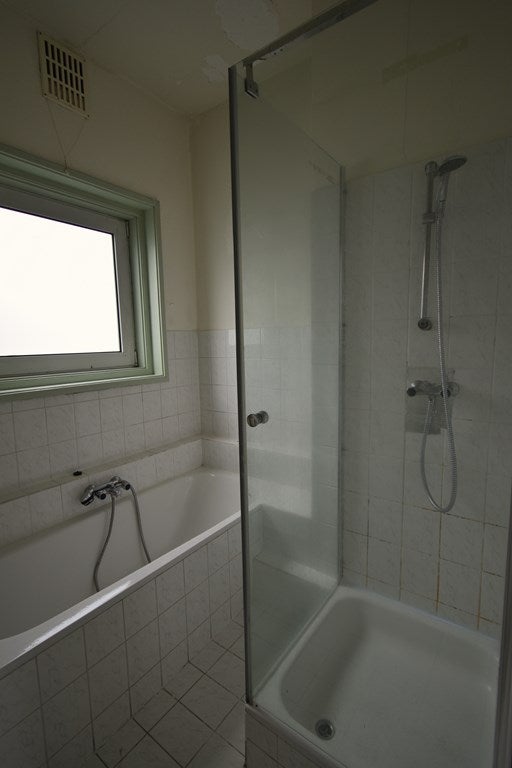 De badkamer is ingericht met een bad, douche en wastafel.