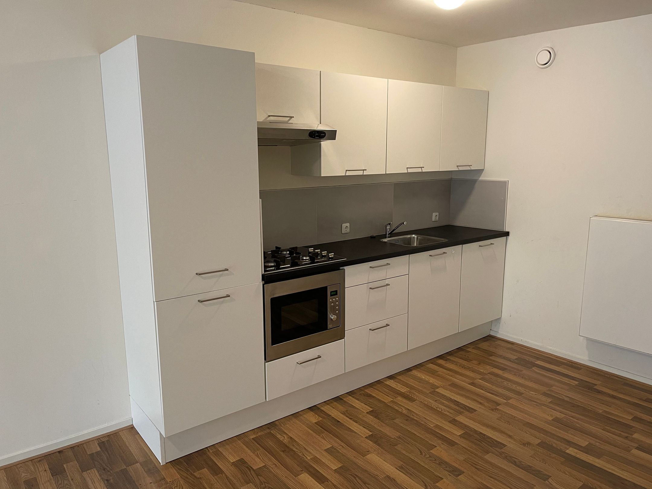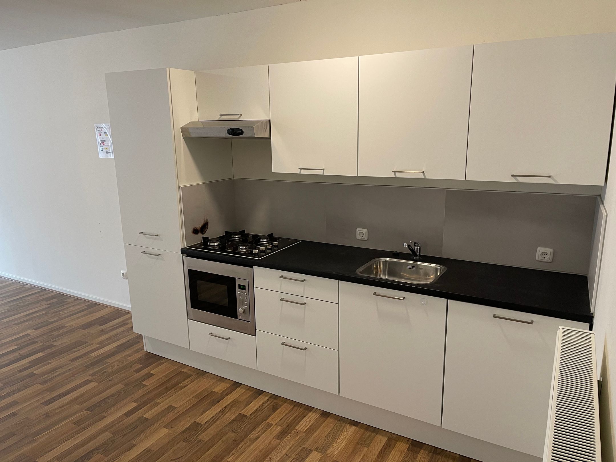 vaatwasser, combimagnetron, koelkast, vriezer, gaskookplaat en afzuigkap). De woonkamer kijkt uit op de Voorstraat.