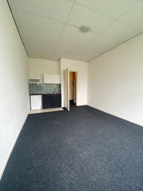 De studio (30 m2) beschikt over een woonkamer met open keuken .