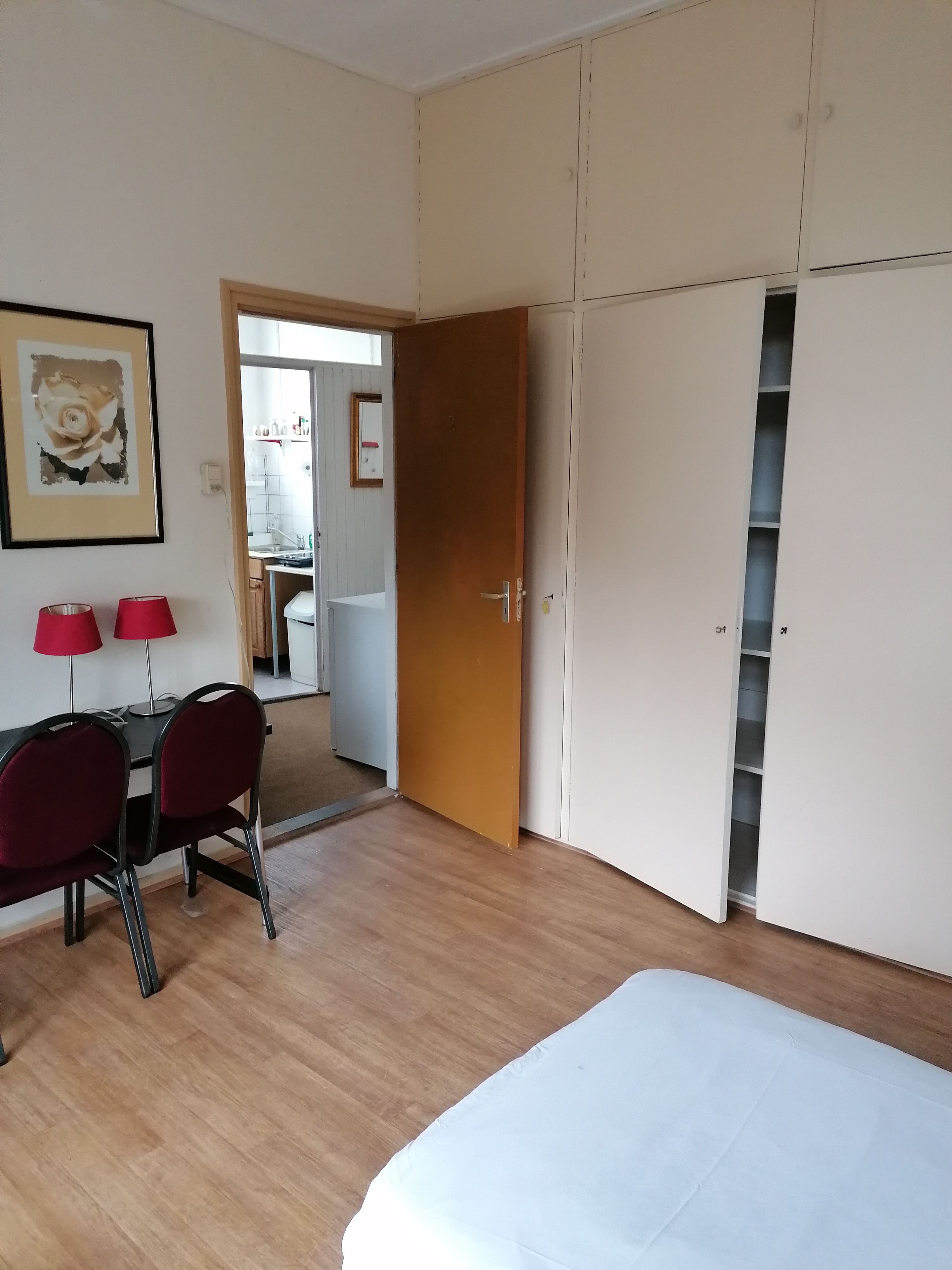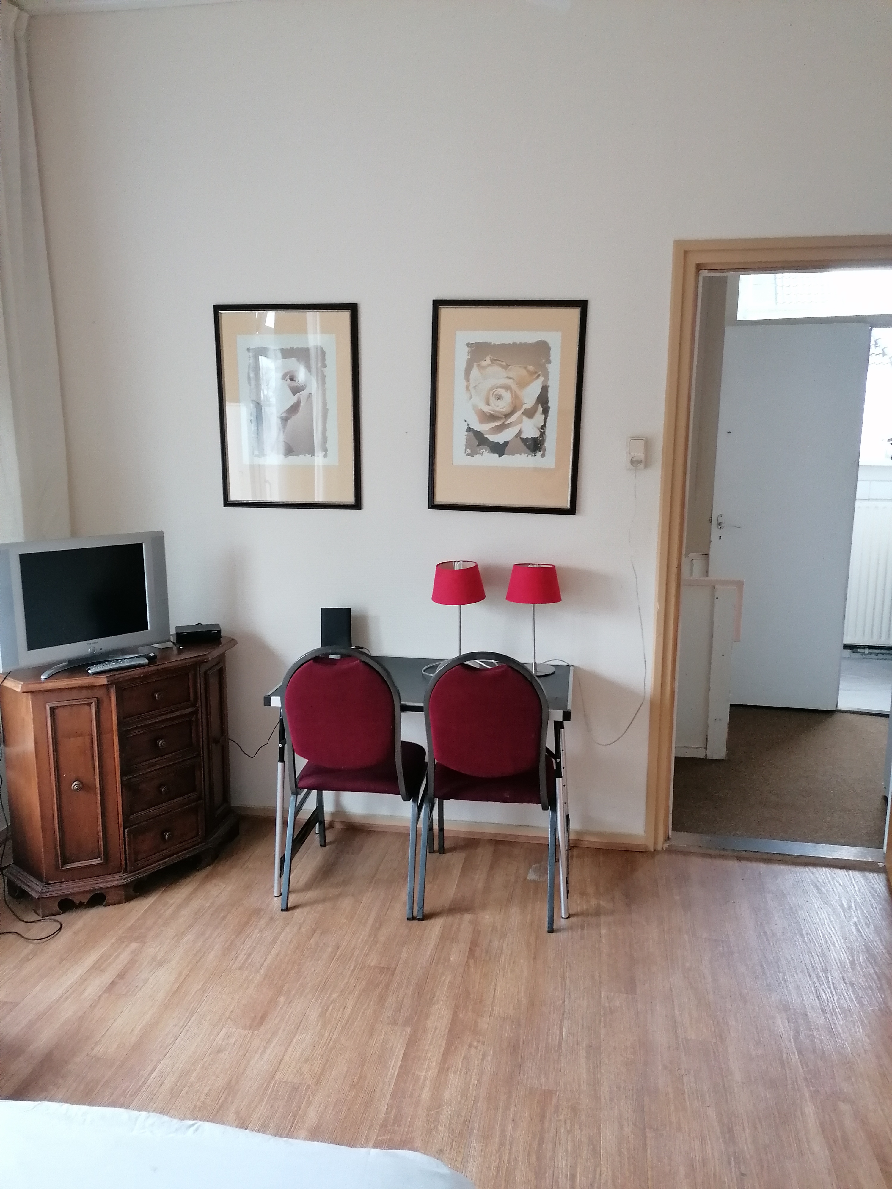 kamer heeft 3 grote kasten, is gemeubileerd, hotelbed, tafel, stoelen, televisie, alles is aanwezig