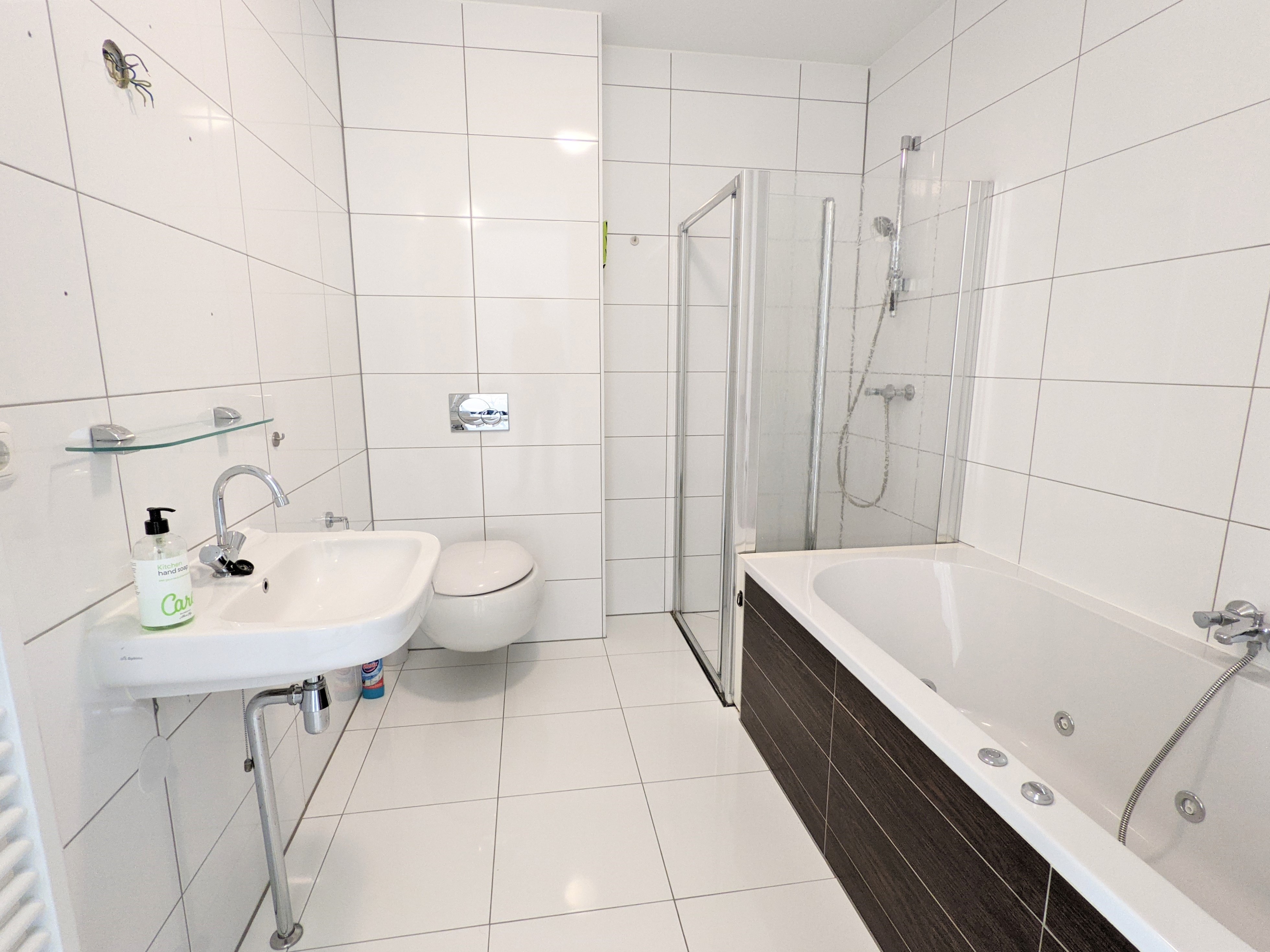 Je maakt gebruik van de gezamenlijke luxe douche (regendouche/massagejets) en nette en schone WC.