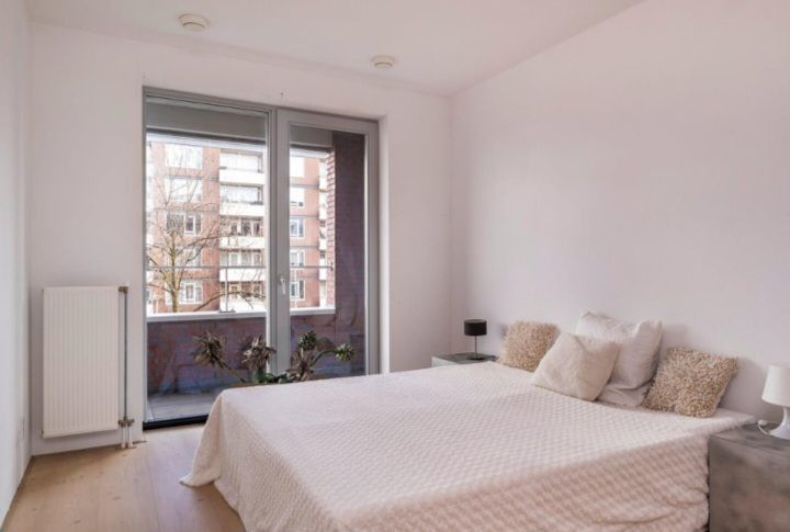 Het appartement omvat een ruime woonkamer met open keuken en toegang tot een zonnig balkon, twee slaapkamers met grote ramen, en een moderne badkamer met inloopdouche.