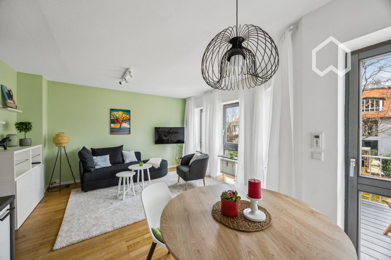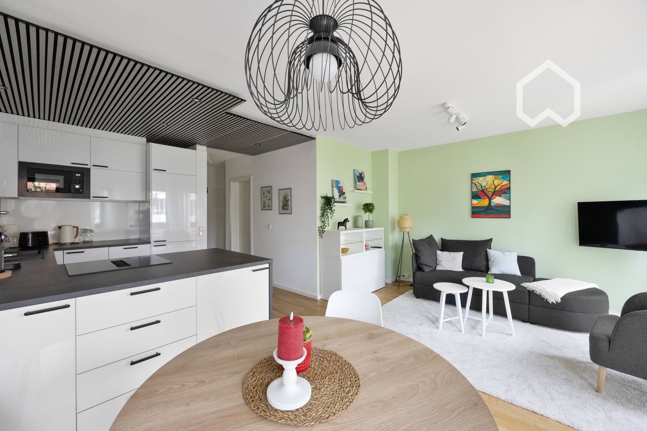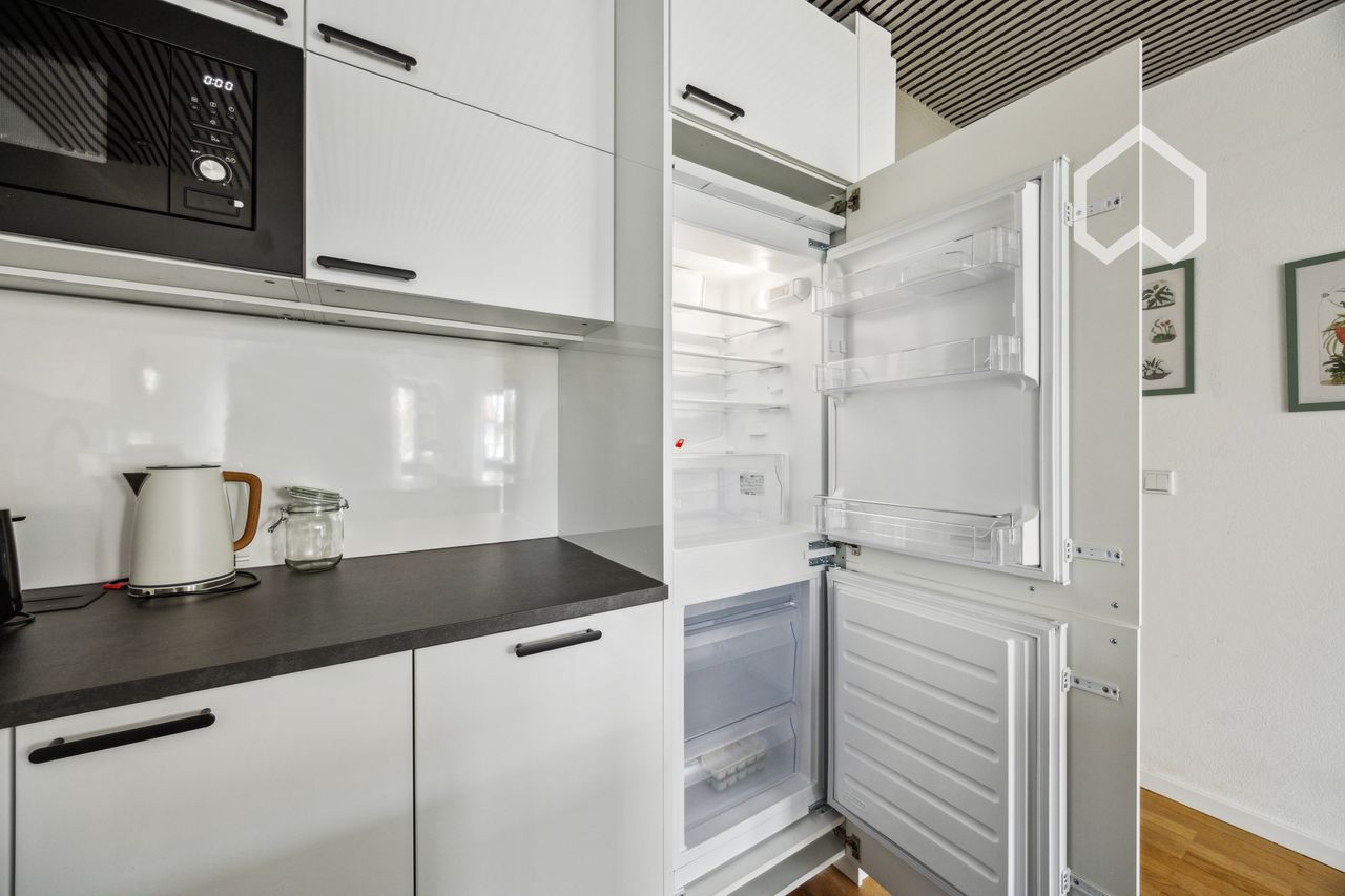 Te huur is een volledig gemeubileerd 2-kamerappartement op de 1e verdieping van een klein wooncomplex.
