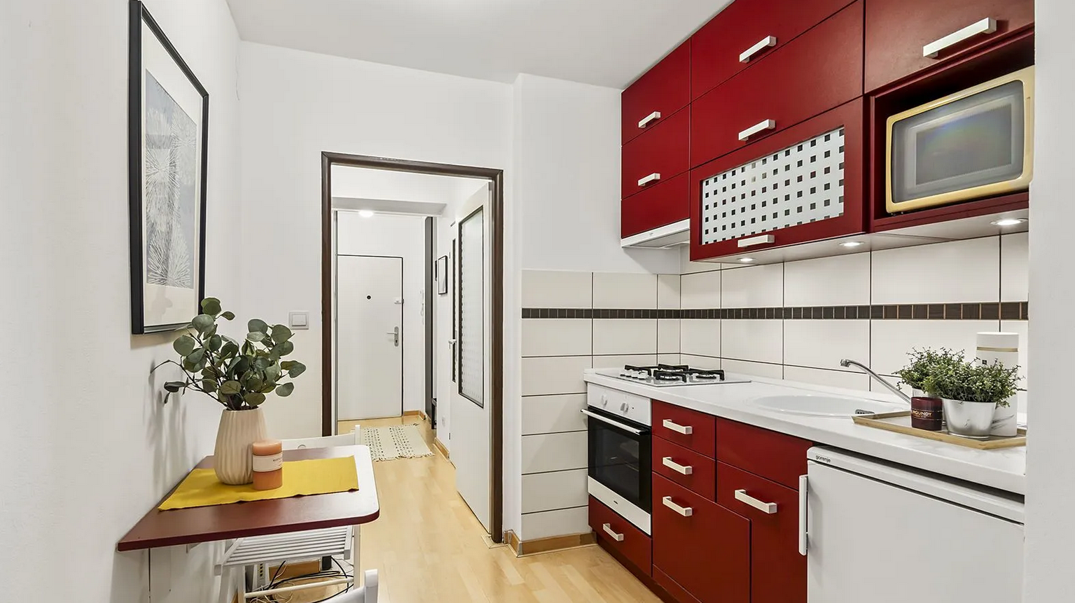 The apartment is fully furnished with furniture and appliances.