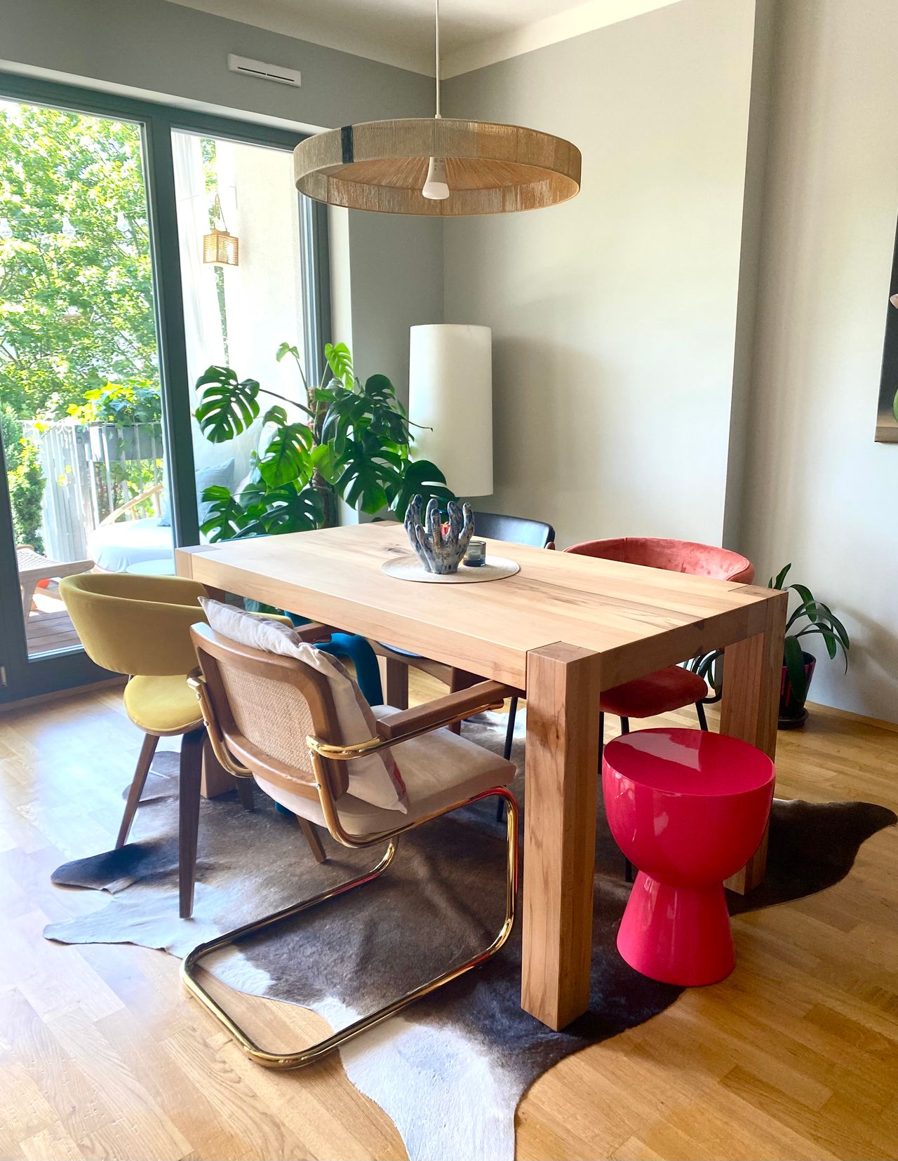 De woon-eetkamer komt uit op het balkon met een bistrotafel, comfortabel bed en planten. Perfect om van de lente te genieten.