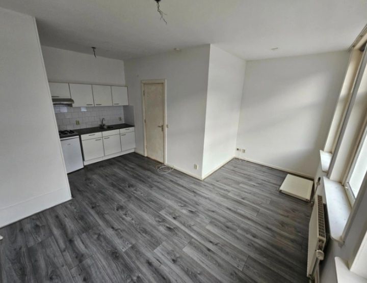 Lichte, ruime ongemeubileerde studio op de eerste verdieping met eigen keuken (gootsteen, kookplaat, koelkast) en douche eigen toilet eigen voordeur..