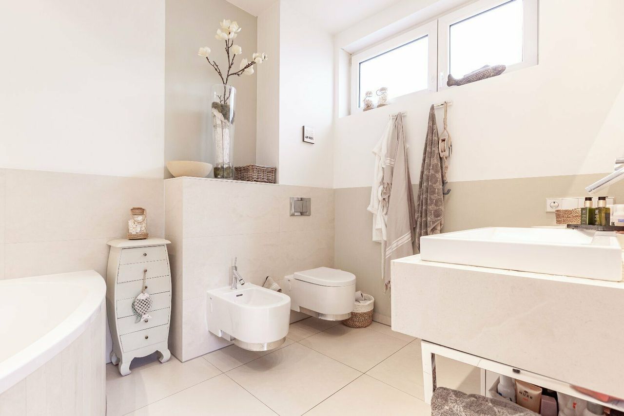 Hoofdbadkamer met hoekbad en grote glazen schuifdeur waardoor u tijdens het baden kunt genieten van een fantastisch uitzicht op de tuin. Snelle WiFi door het hele huis en ook in de tuin. Wasmachine / droger, Nespresso-apparaat..