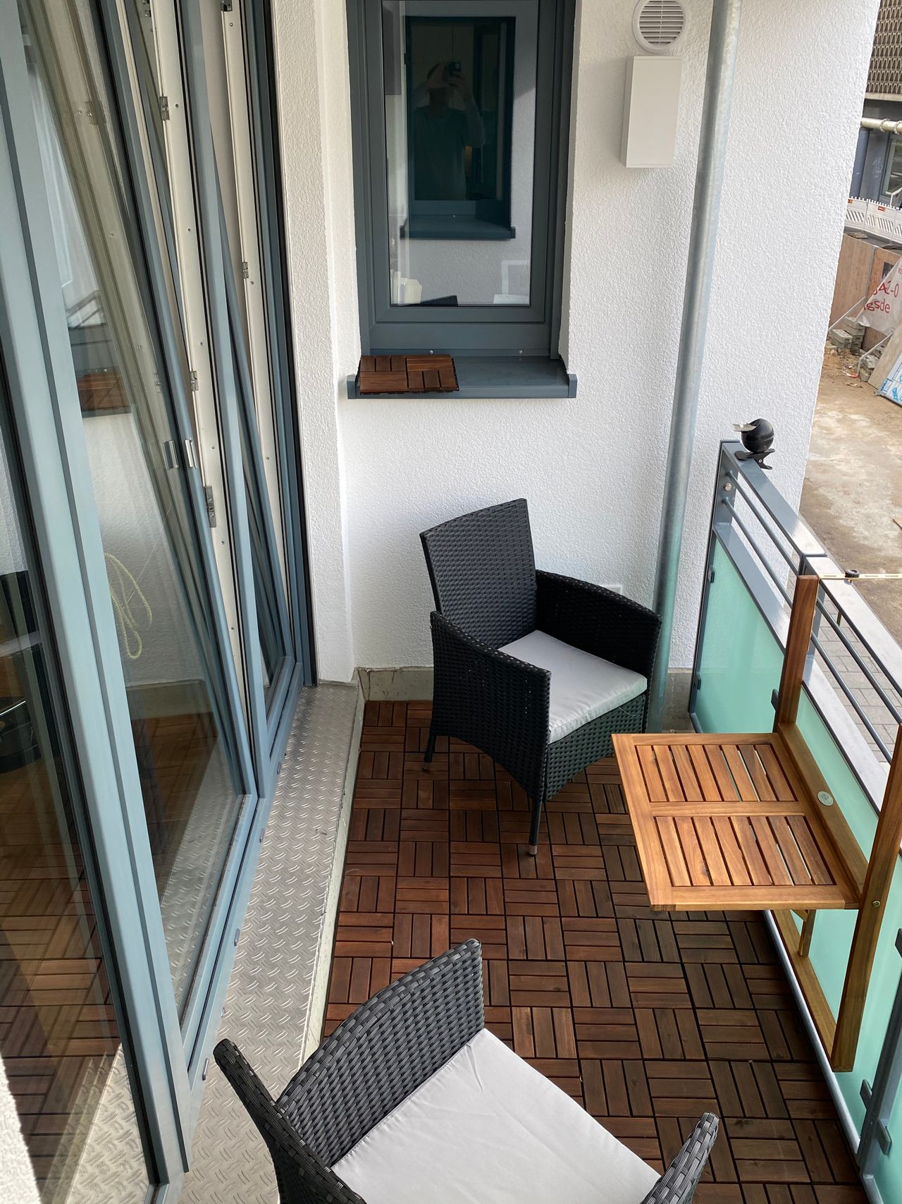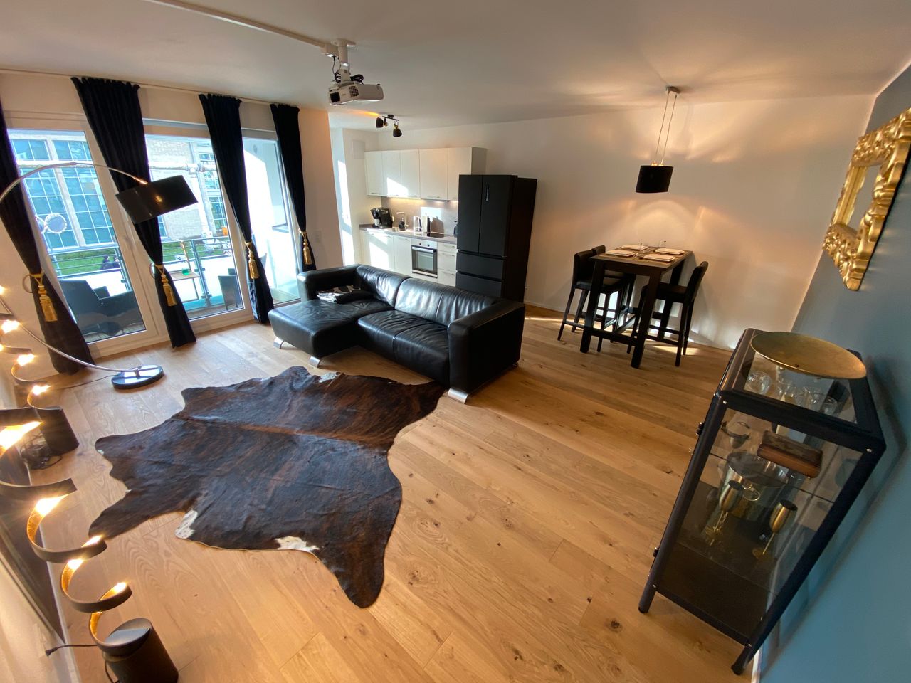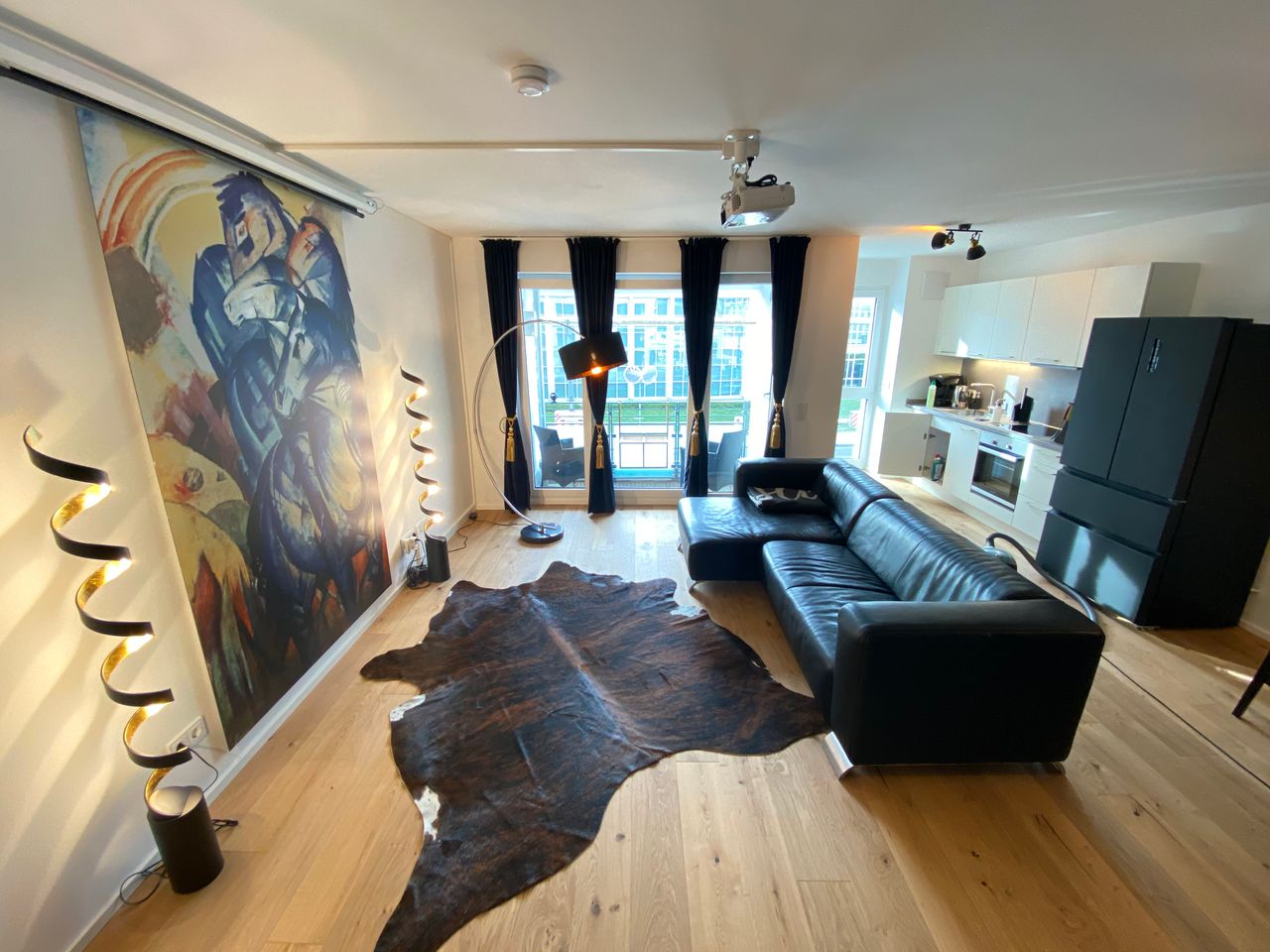 - Woonkamer met houten vloer en cv, tafel/werktafel met 4 leren fauteuils, beamer met aansluiting kabel TV (inclusief internationaal taalpakket) en internet plus Apple TV; WiFi overal in het appartement