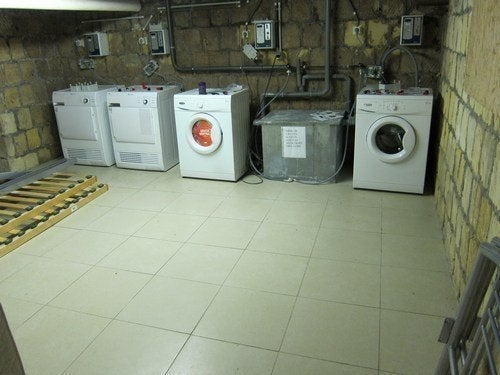 In de kelder bevindt zich een gezamelijke ruimte met een wasmachine en een droger.