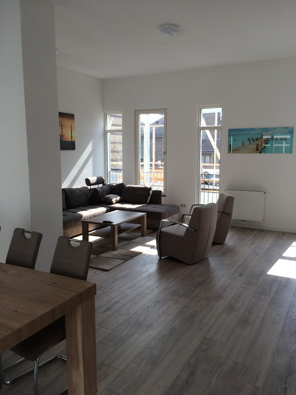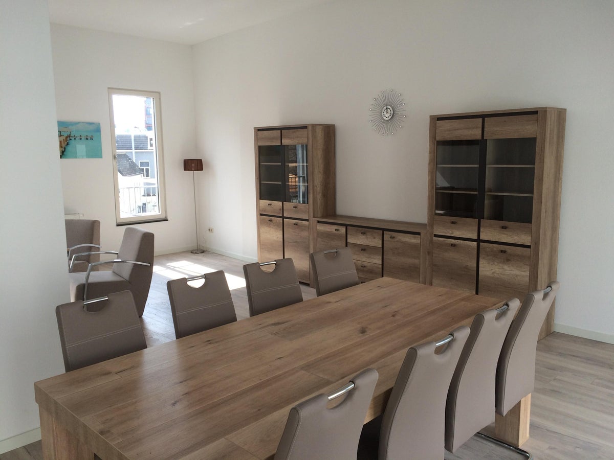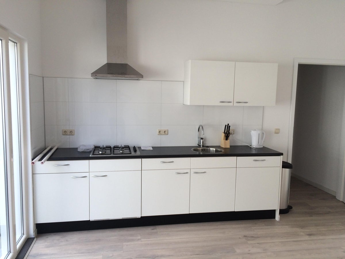 Het appartement beschikt over een ruime woonkamer met een open keuken. De keuken is voorzien inbouwapparatuur ( kookplaat, afzuigkap, vaatwasser en koelkast met combi oven/magnentron).