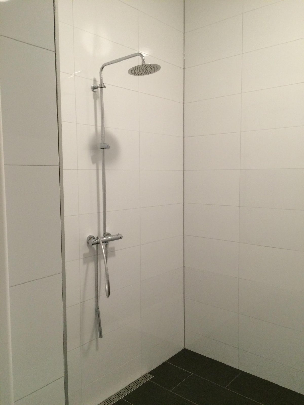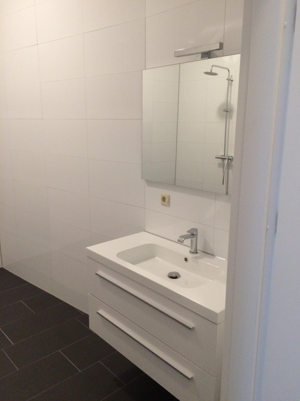 De badkamer is voorzien van een inloopdouche, wastafel met meubel, spiegel,thermostaatkraan met glijstang ,design radiator en & hangtoilet.