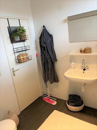 Via de gang bereik je aan de linkerkant de moderne badkamer, afgewerkt met een stijlvolle grijze tegelvloer. De badkamer beschikt over een ruime douchecabine, een wastafelmeubel met verlichting en een toilet.