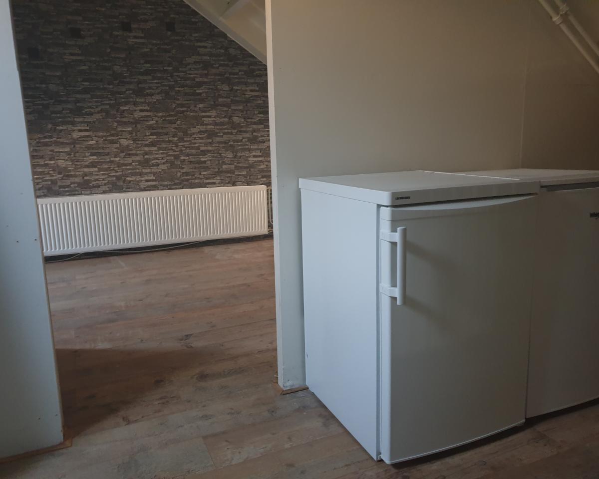 De te huren ruimte bestaat uit een slaapkamer (12 m^2) en een woonkamer/keuken (17 m^2).