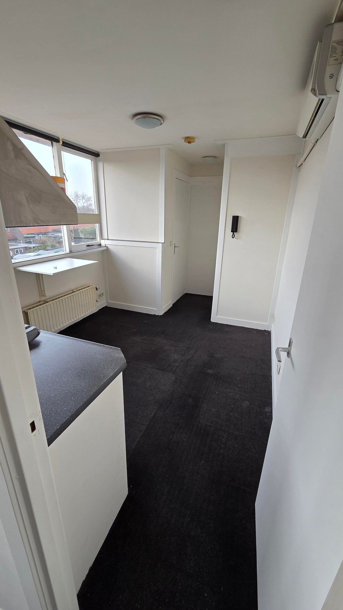 Indeling; entree, woonkamer met open keuken, badkamer en slaapkamer.