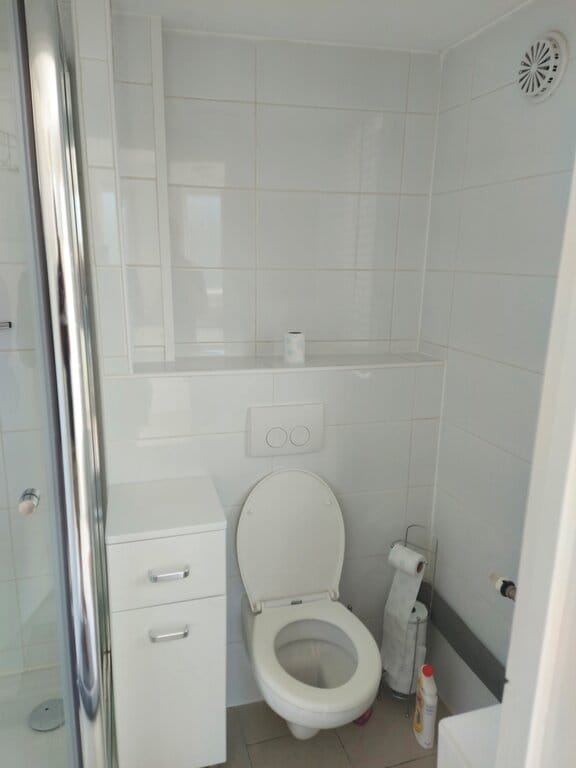 De badkamer heeft een zwevend toilet, douche en wastafel met spiegel.