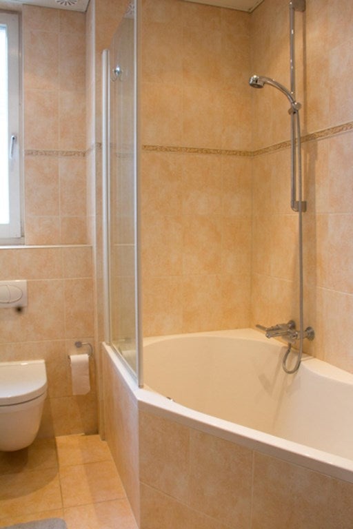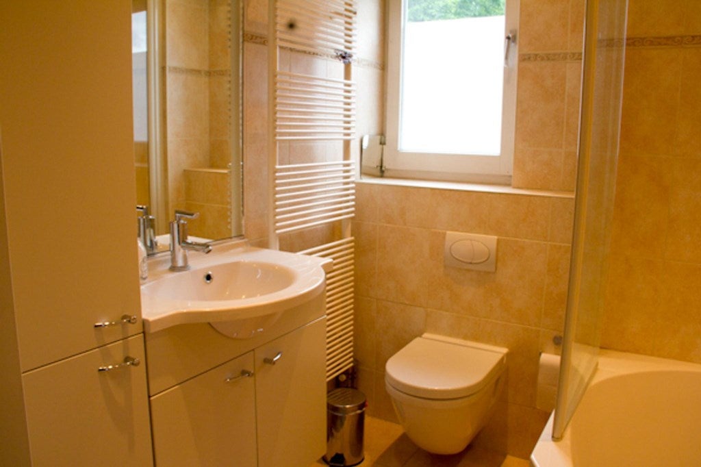 Badkamer met ruim wastafelmeubel, ligbad met douchewand en toilet.