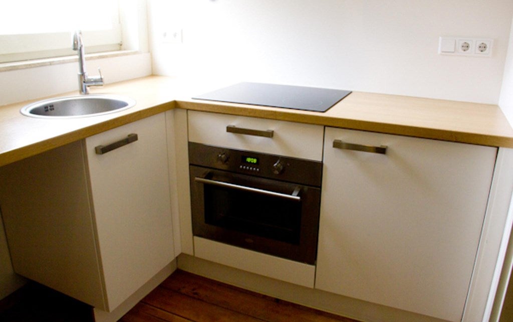 Begane grond Centrale entrée met brievenbussen, eigen voordeur geeft toegang tot het appartement, woon/slaapkamer (3.81 x 3.70) met houten vloer, airco en dubbele openslaande deuren naar de gezellige tuin. Verder een nette keuken (2.80 x 1.93) met onder andere koelkast met vriesvakje, oven, keramische kookplaat en voldoende opbergruimte en ruimte voor een eettafel. In de keuken zit ook de aansluiting voor een wasmachine.