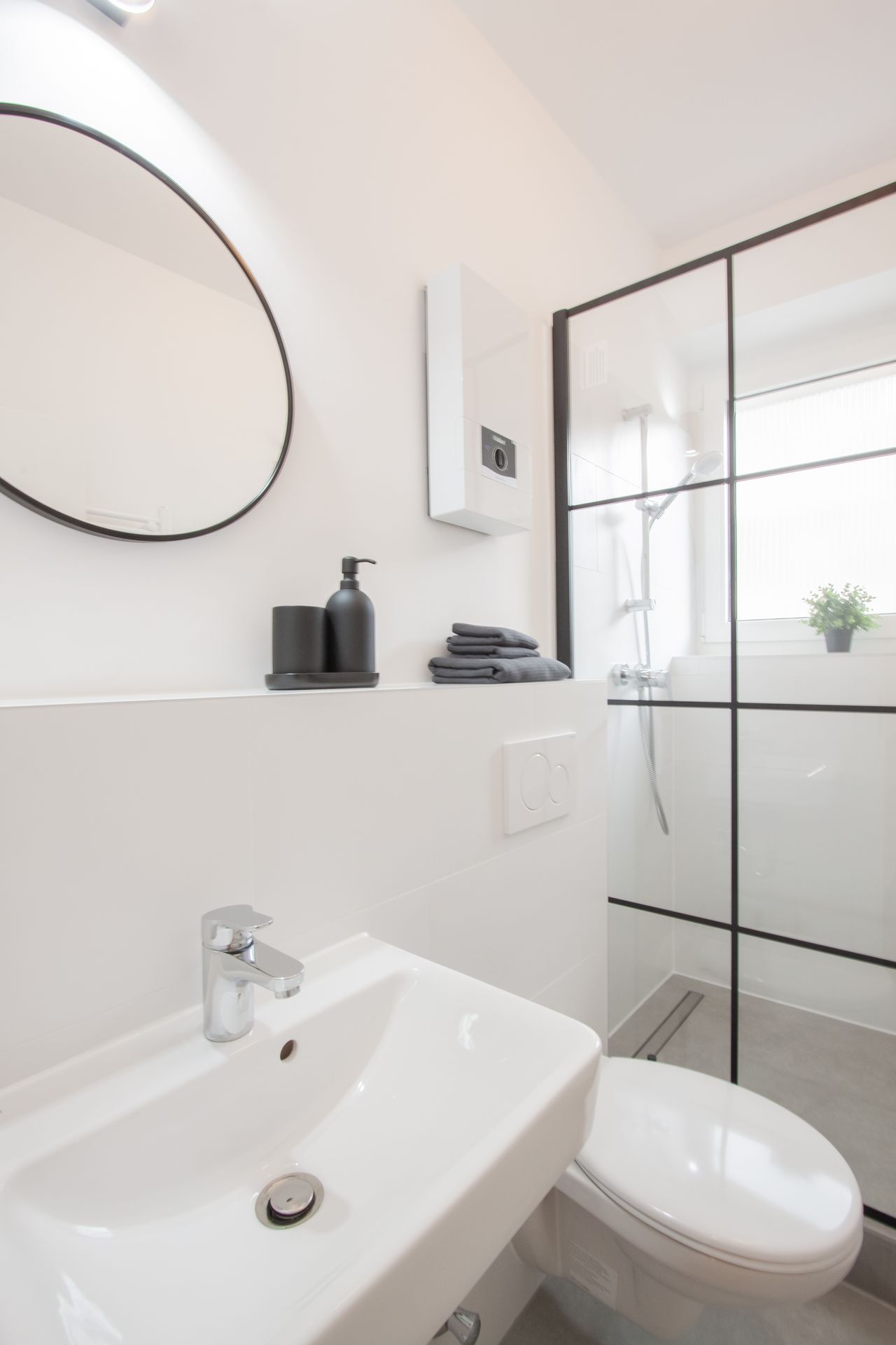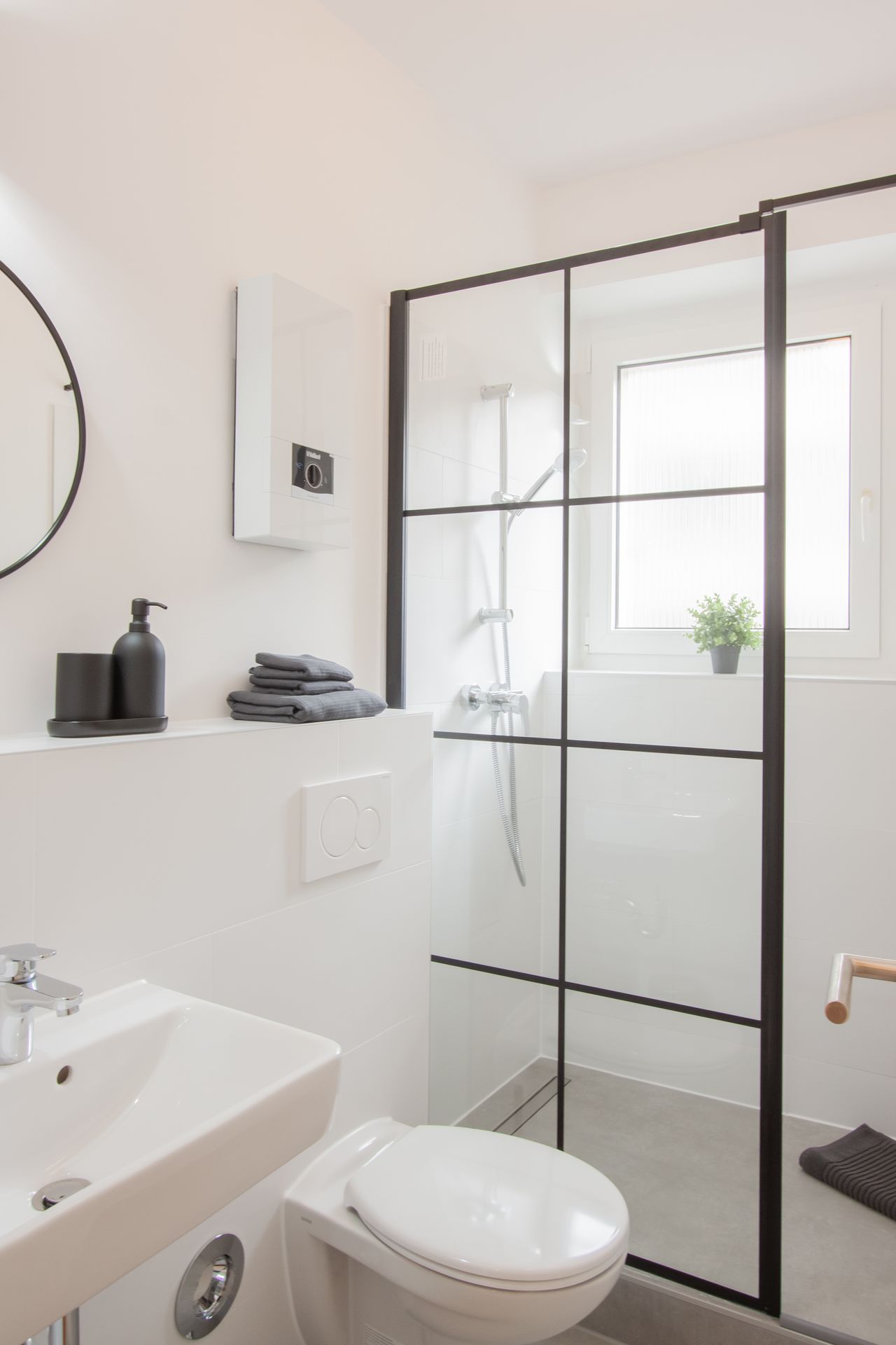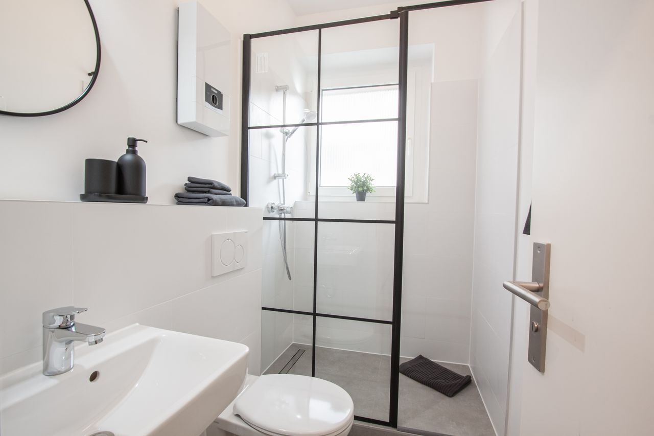 De gang leidt ook naar een moderne badkamer met een groot raam.