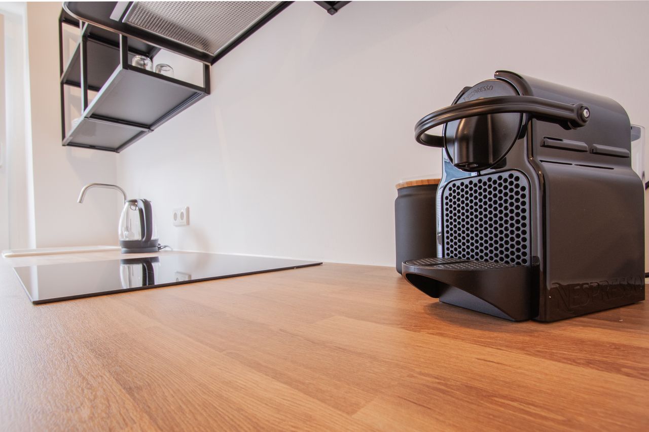 De aparte keuken is voorzien van kookgerei, oven, keramische kookplaat, vaatwasser, waterkoker, afzuigkap, koffiezetapparaat en een eettafel en stoel combinatie.