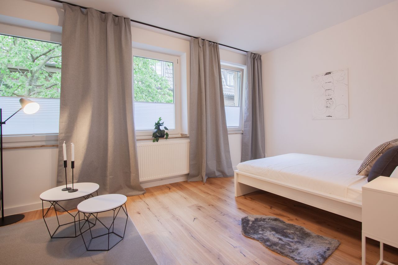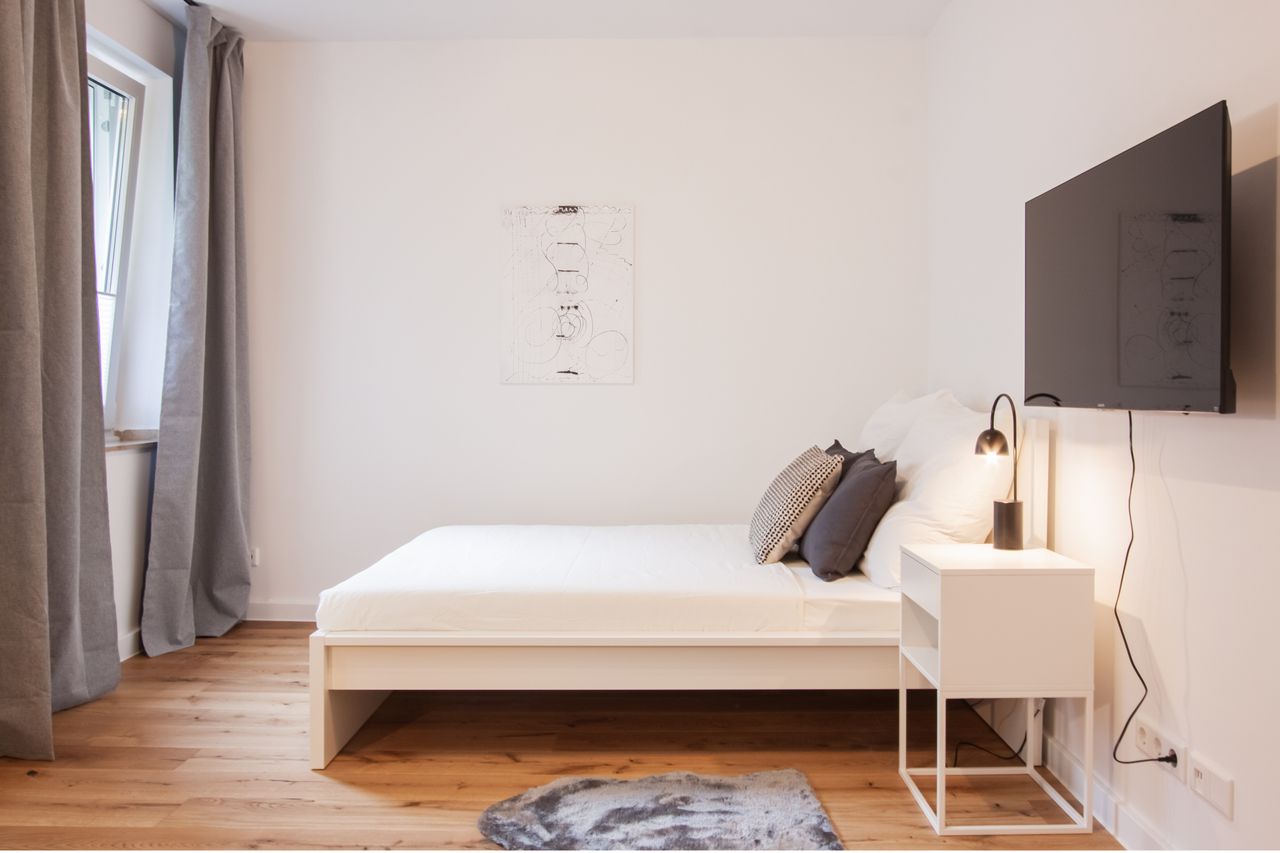 Het ruime woon-/slaapgedeelte, overspoeld met licht door 3 ramen, is ingericht met een comfortabel bed, een kledingkast, een stoel en een smart-tv.