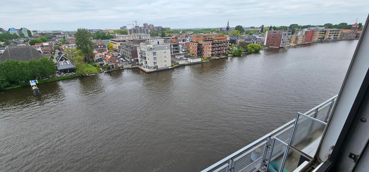 Trap naar etage, overloop, de kamer welke zich aan de achterzijde van de woning bevindt biedt een prachtig uitzicht over Zaandam en rivier de Zaan, er is een gezamenlijke badkamer met douchecabine, ligbad, dubbele wasbak en toilet, in een separate ruimte staat de wasmachine welke ook voor gezamenlijk gebruik is.