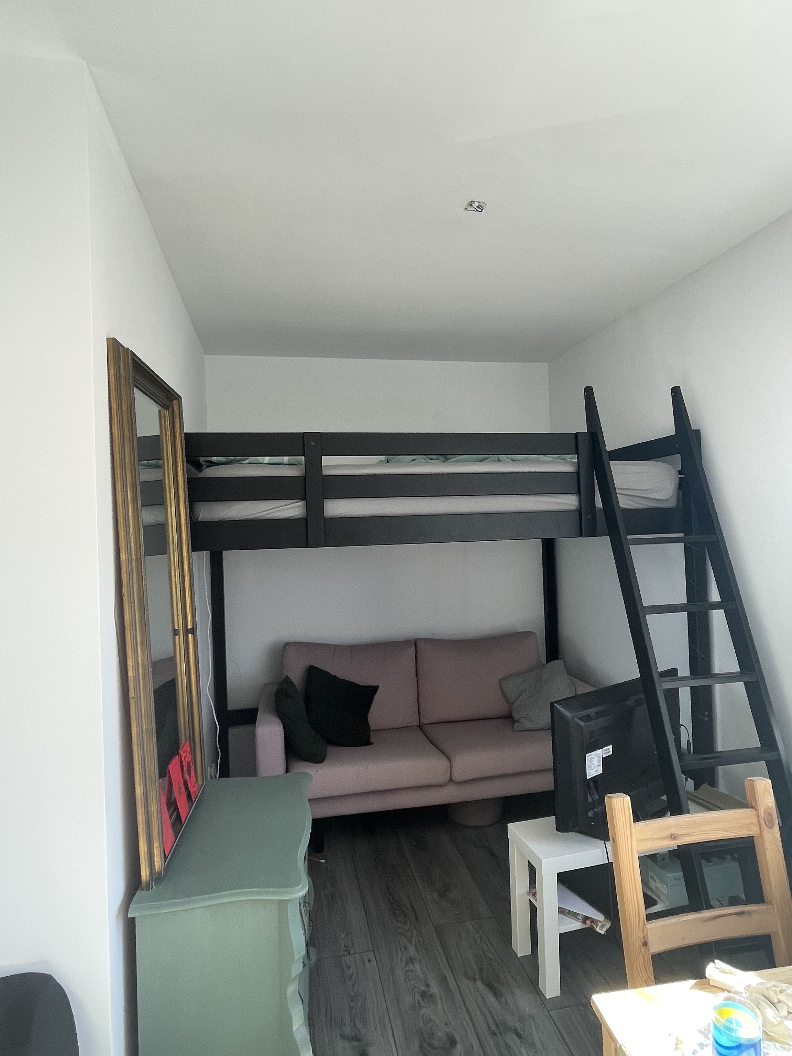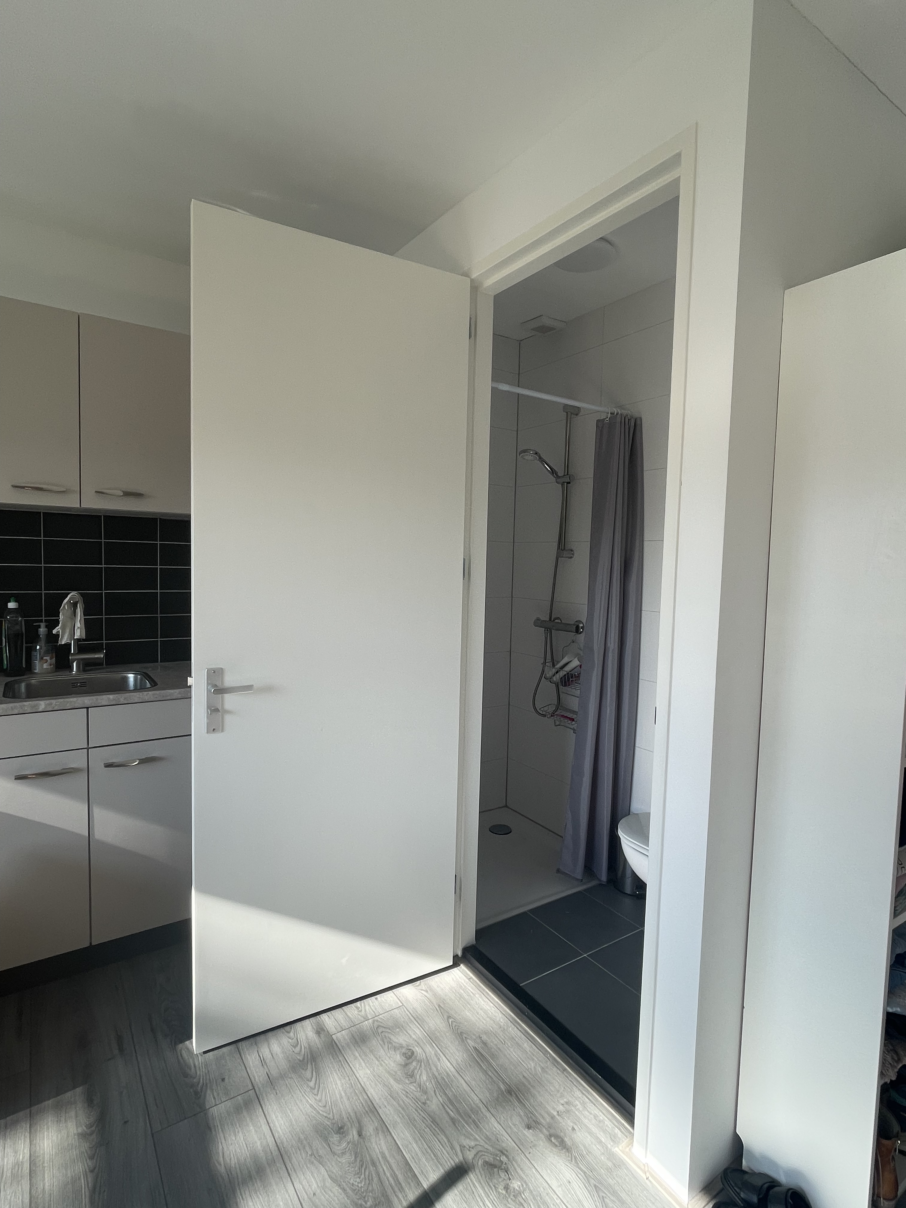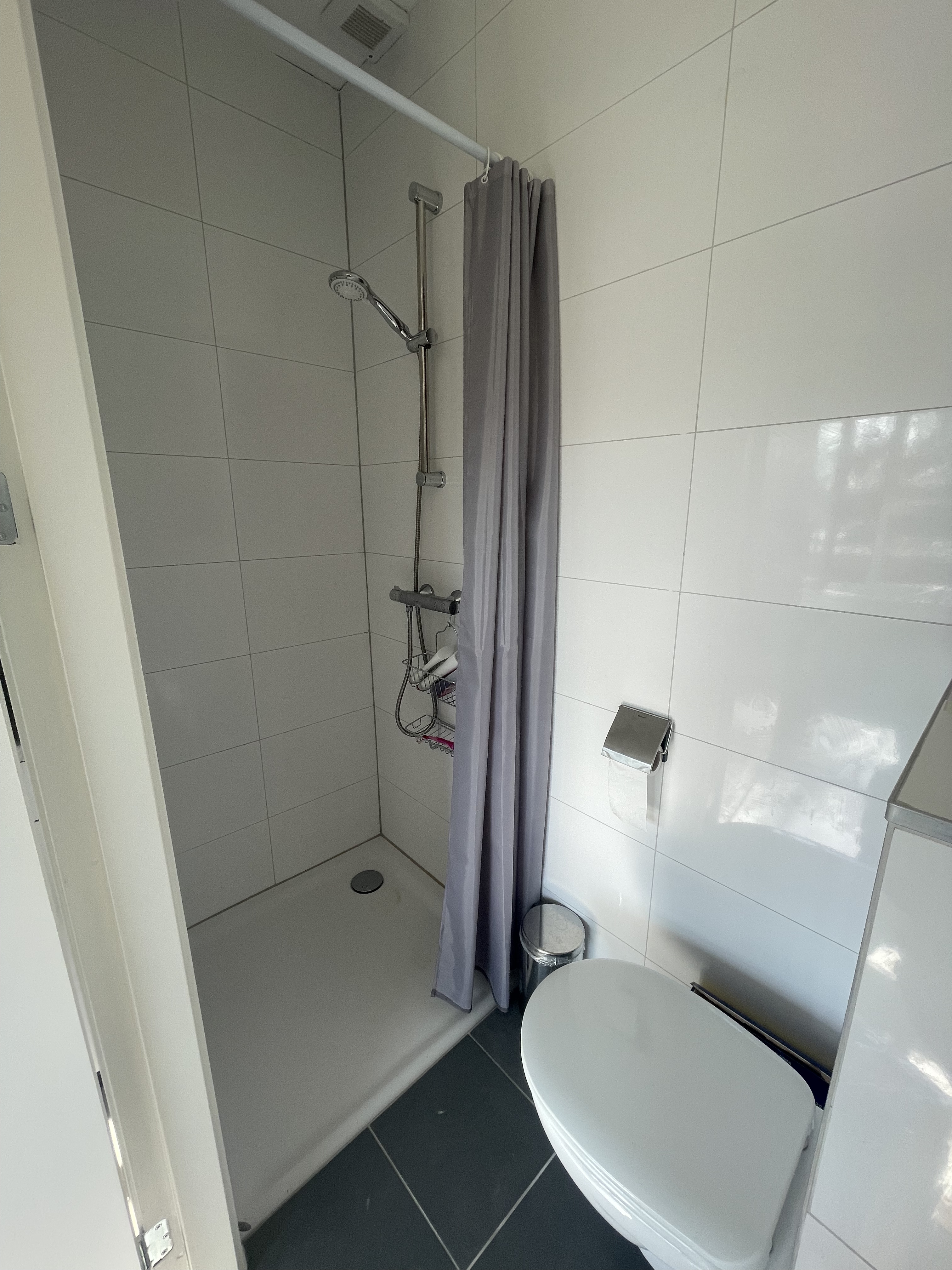 It is a studio of +/-20 m2 with its own living room/bedroom, shower, toilet, kitchen and private entrance. There is a communal washing machine, vacuum cleaner, bicycle rack and a large garden.