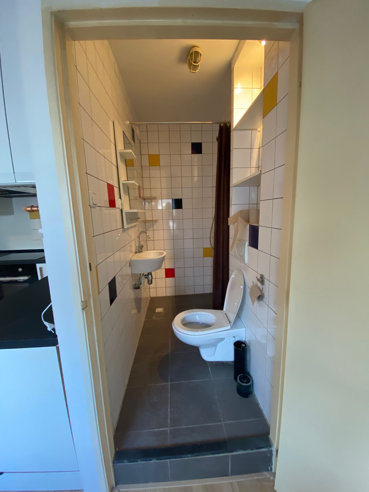 De badkamer is netjes afgewerkt en voorzien van een douche, toilet en wastafel.