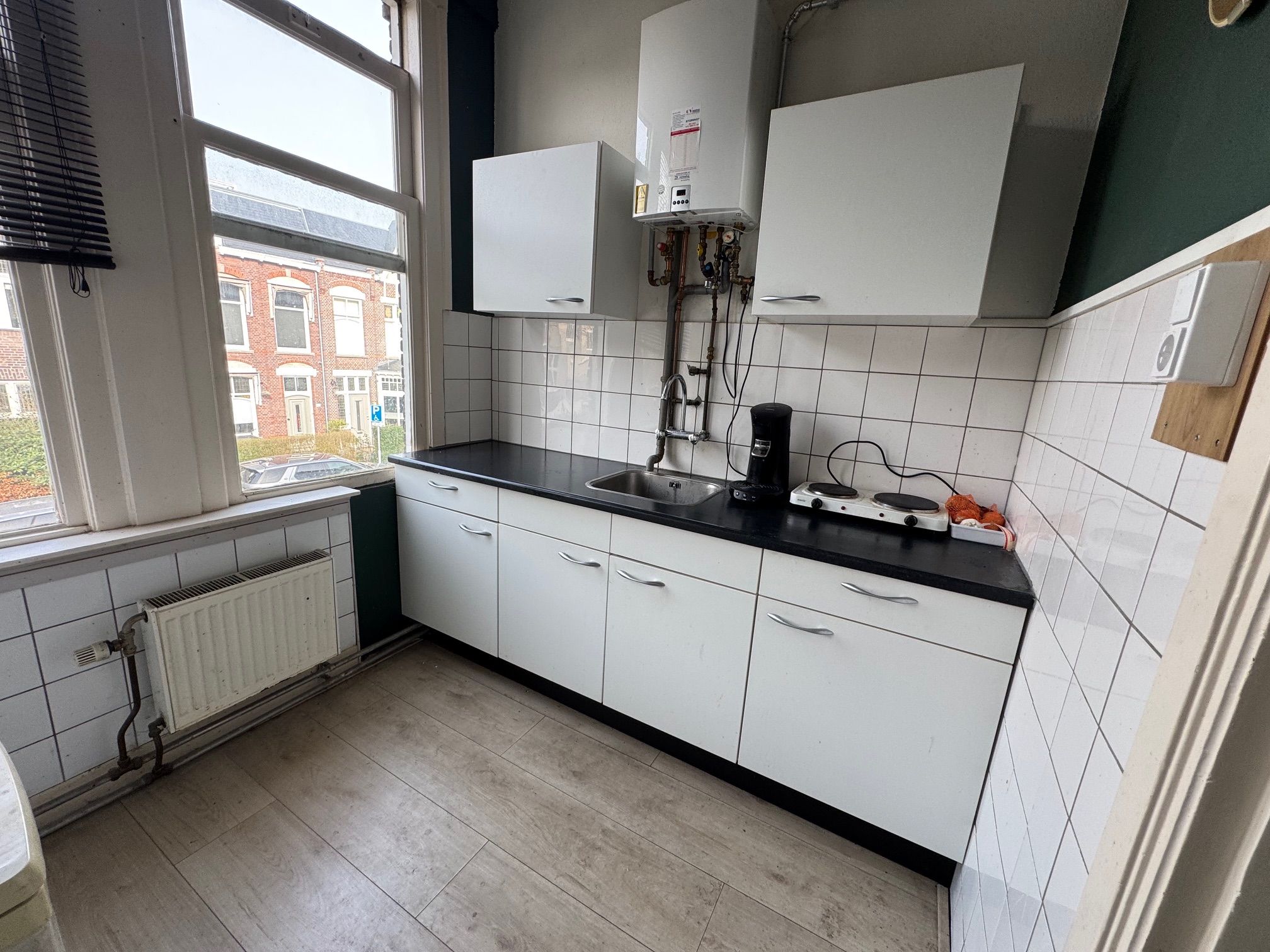 Op centrale locatie gelegen studentenkamer met je eigen woonkamer en eigen slaapkamertje, 2 gedeelde badkamers, 2 toiletten, 1 gemeenschappelijke keuken.