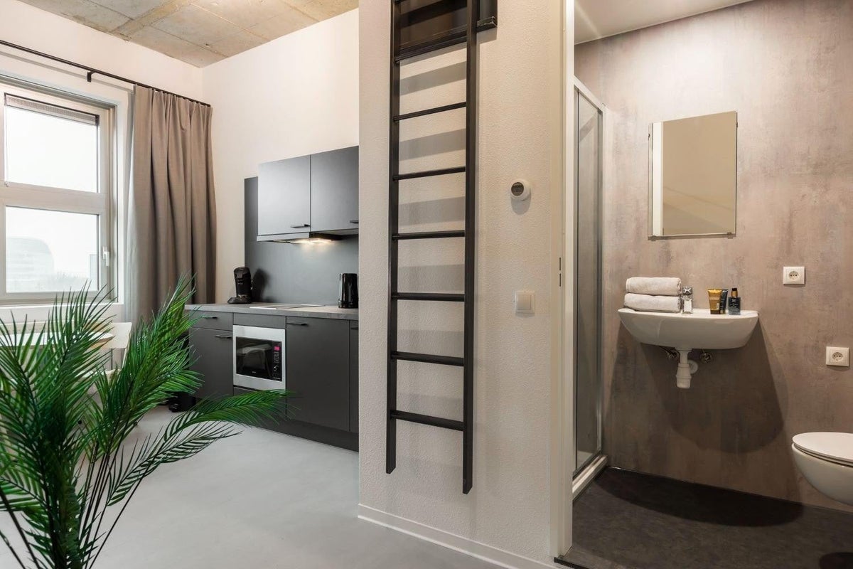 STAYground bestaat uit 230 studentenstudio's en 40 expatstudio's. Deze studentenstudio biedt alles wat je nodig hebt om comfortabel te wonen en te studeren. De studio is volledig gemeubileerd met een maatwerk interieur en beschikt over een ruimtebesparende hoogslaper. De studio heeft een moderne zwarte keuken en een eigen badkamer met toilet, wastafel en douche.