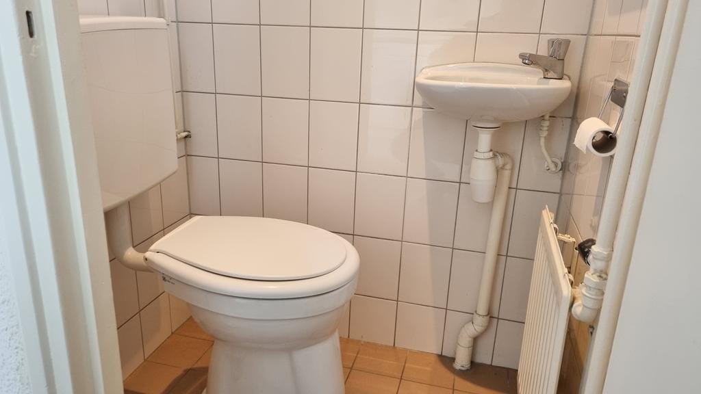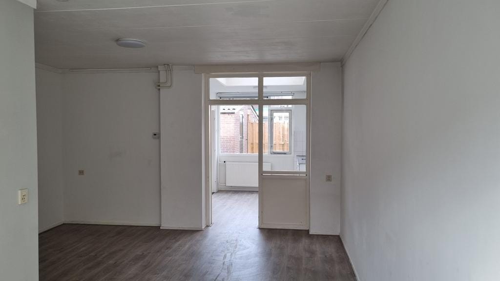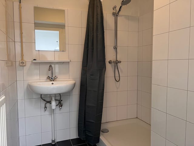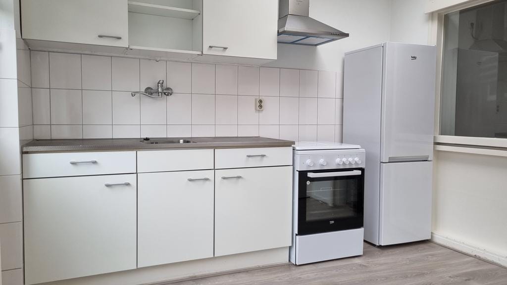L-vormige woonkamer - ca. 24 m² -. Open keuken met een basis keukenblok en enkele nieuwe losse apparatuur. Badkamer met een douche en een wastafel.