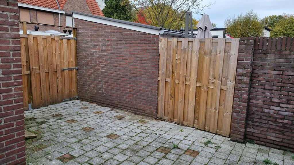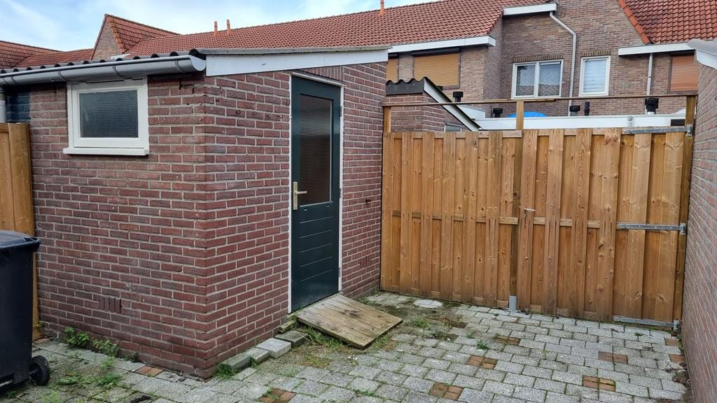 Achtertuin, gesitueerd op het westen, met een terras, een gemetselde buitenberging en een achteringang.