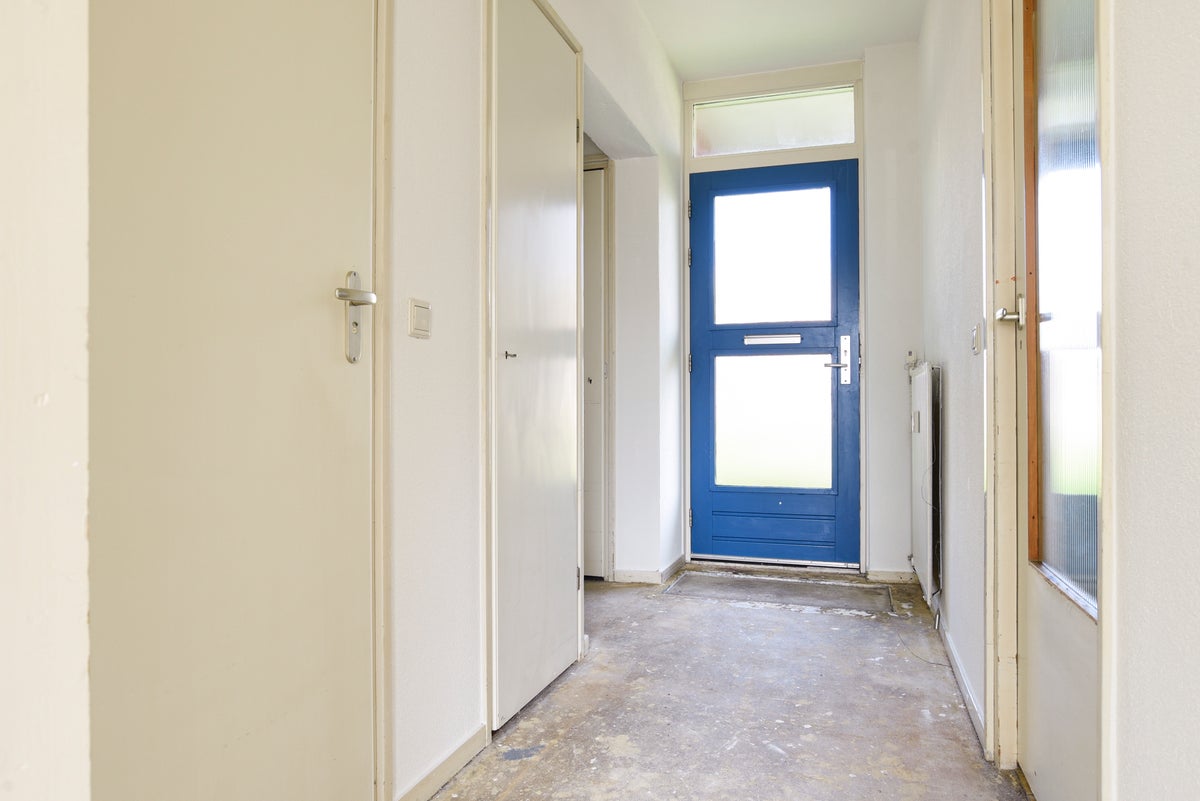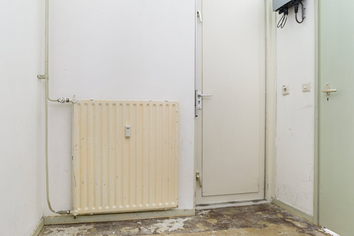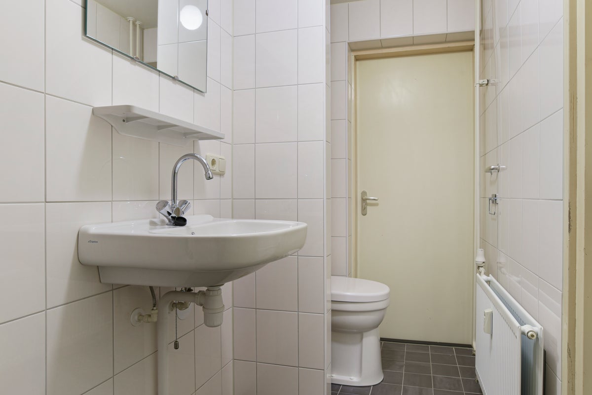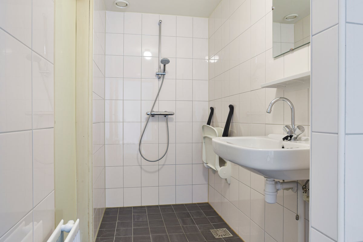Als u het appartement betreedt, komt u in de centrale gang. Aan de linkerkant van deze hal vindt u naast de meterkast en een gangkast ook de badkamer en een inpandige berging (met boiler voor de blokverwarming). De badkamer is voorzien van een wastafel, douche, radiator en toilet.