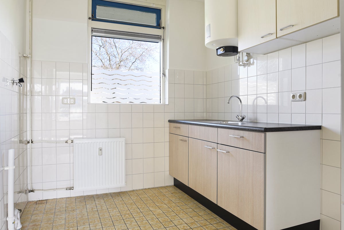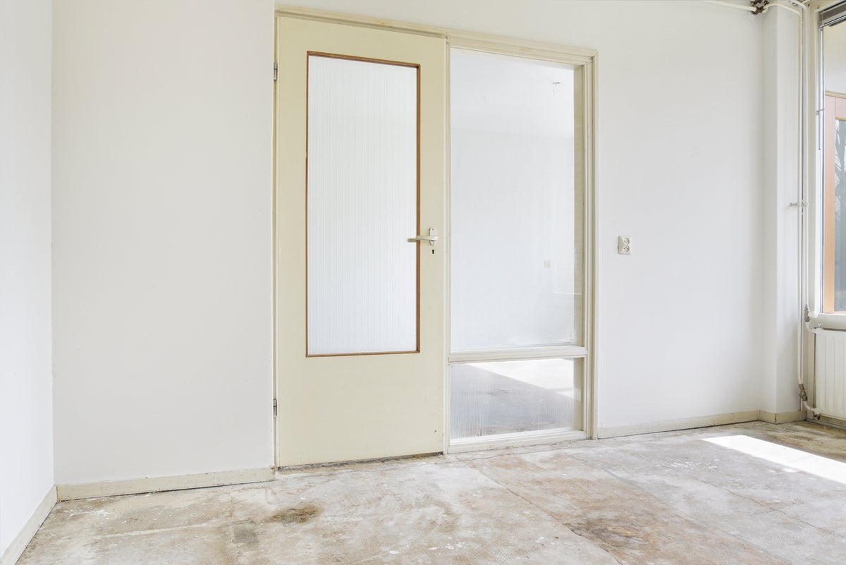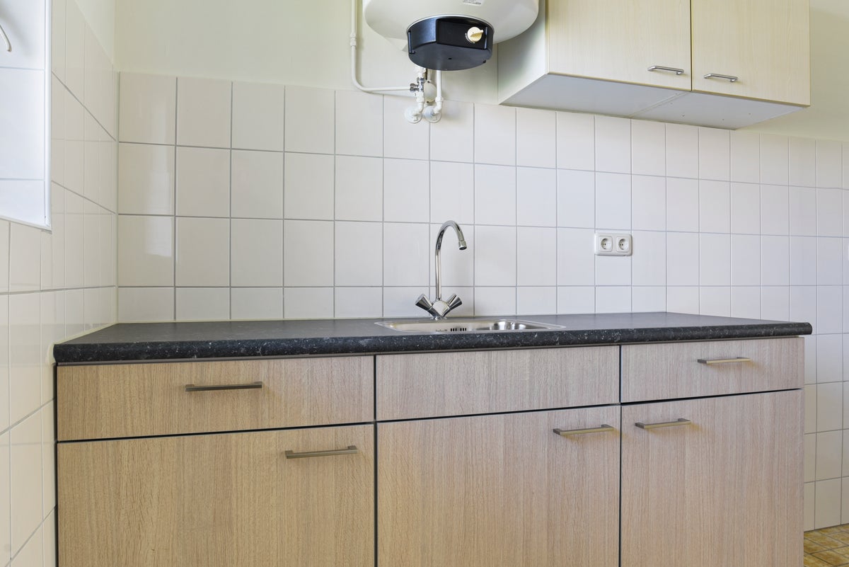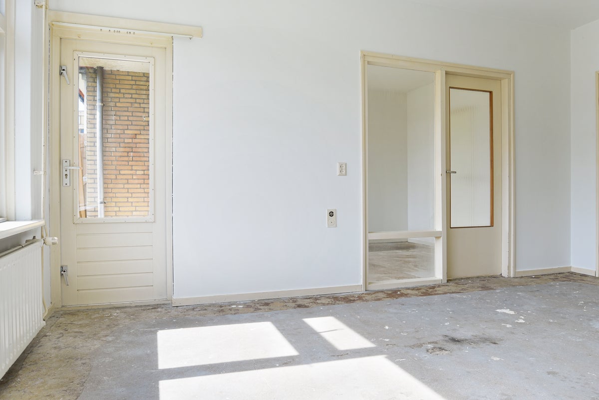 Aan het einde van de gang loopt u de woonkamer van 18 vierkante meter binnen. Vanuit dit vertrek heeft u toegang tot zowel de afgesloten keuken (8 vierkante meter) als de ruime slaapkamer (11,5 vierkante meter). De afgesloten keuken is uitgerust met een standaard keukenblok met kraan. Voor zaken als een kookplaat, afzuigkap, oven/magnetron, koelkast/vriezer en vaatwasser dient u zelf te zorgen.