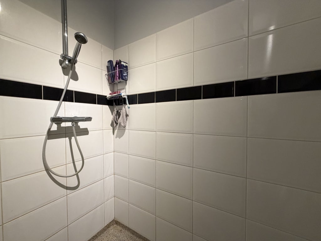 De moderne badkamer is voorzien van een douche, toilet en wastafel.