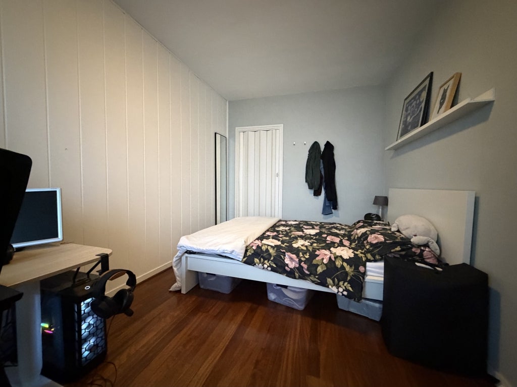 De grote slaapkamer biedt ruimte voor een dubbel bed, heeft een ruime ingebouwde kast en ook toegang tot het balkon.