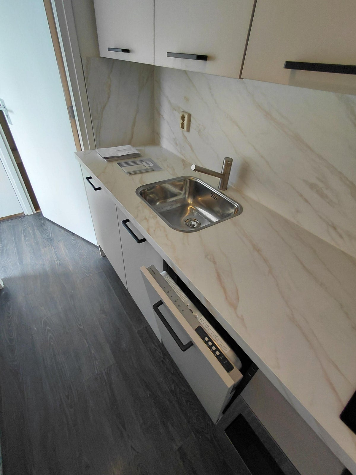 In elke kamer is een nieuwe, volledig uitgeruste keuken geplaatst met een koelkast, vaatwasser, inductiekookplaat en magnetron.