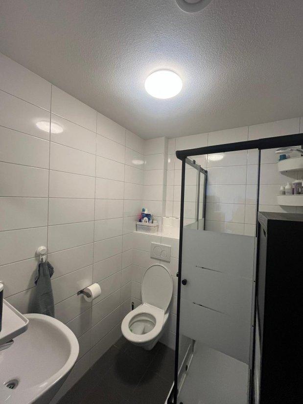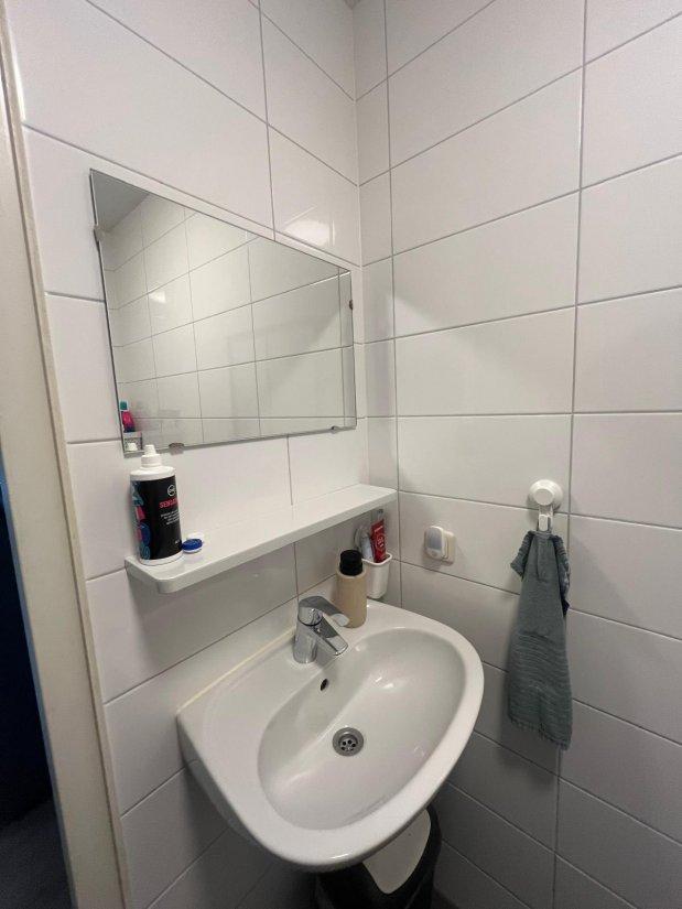 De badkamer is netjes afgewerkt en beschikt over een volledig afgescheiden douche, wastafel met spiegel en toilet. De woning maakt een verzorgde en goed onderhouden indruk.