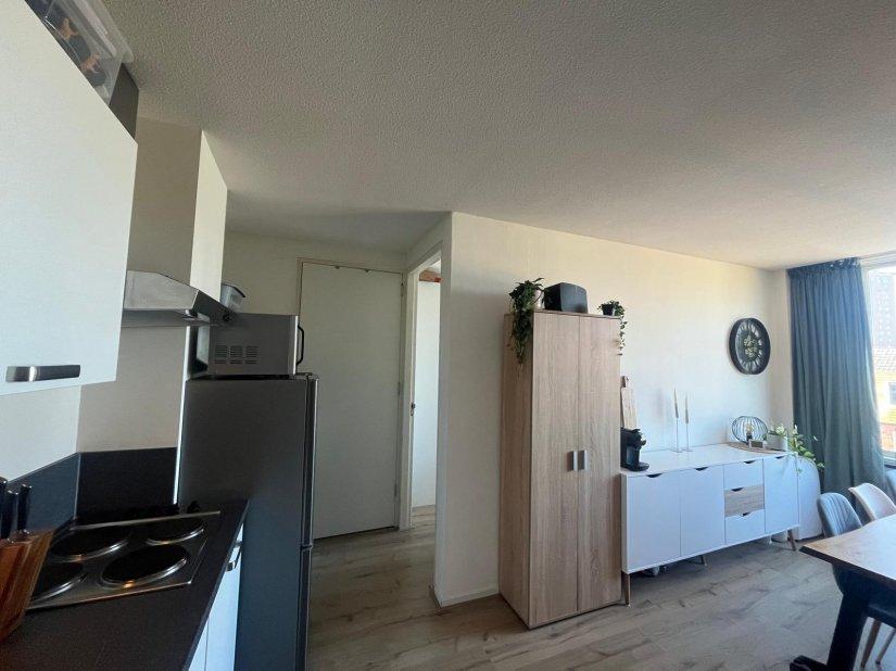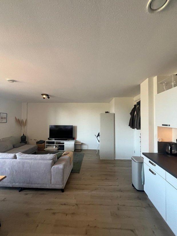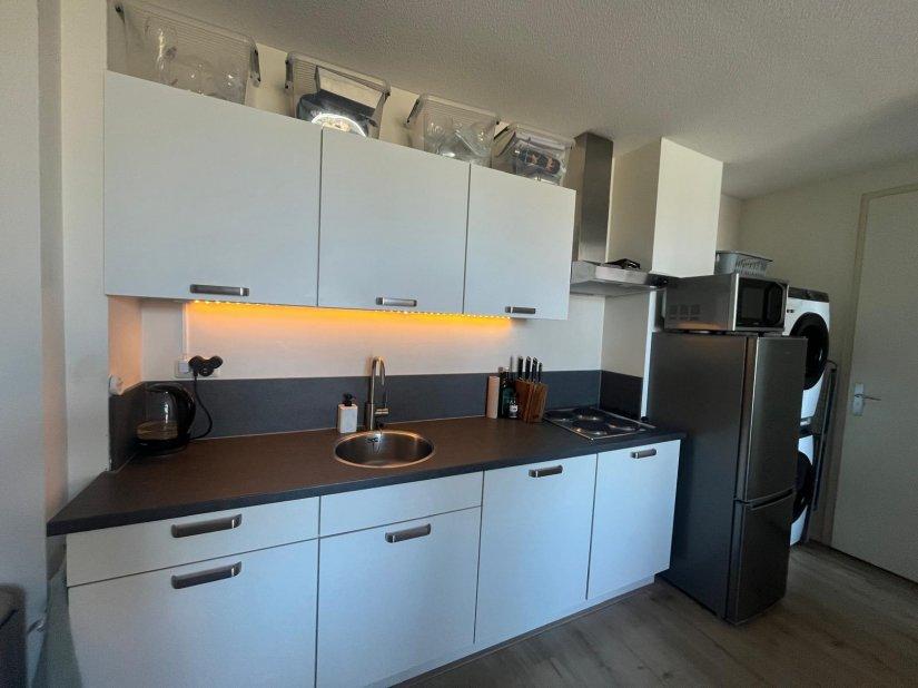 Het appartement beschikt over een praktische indeling met een lichte woonruimte en een open keuken. De keuken is voorzien van een kookplaat, afzuigkap en voldoende kastruimte. Daarnaast is er ruimte voor het plaatsen van een eigen koelkast en zijn er aansluitingen aanwezig voor een wasmachine en droger.