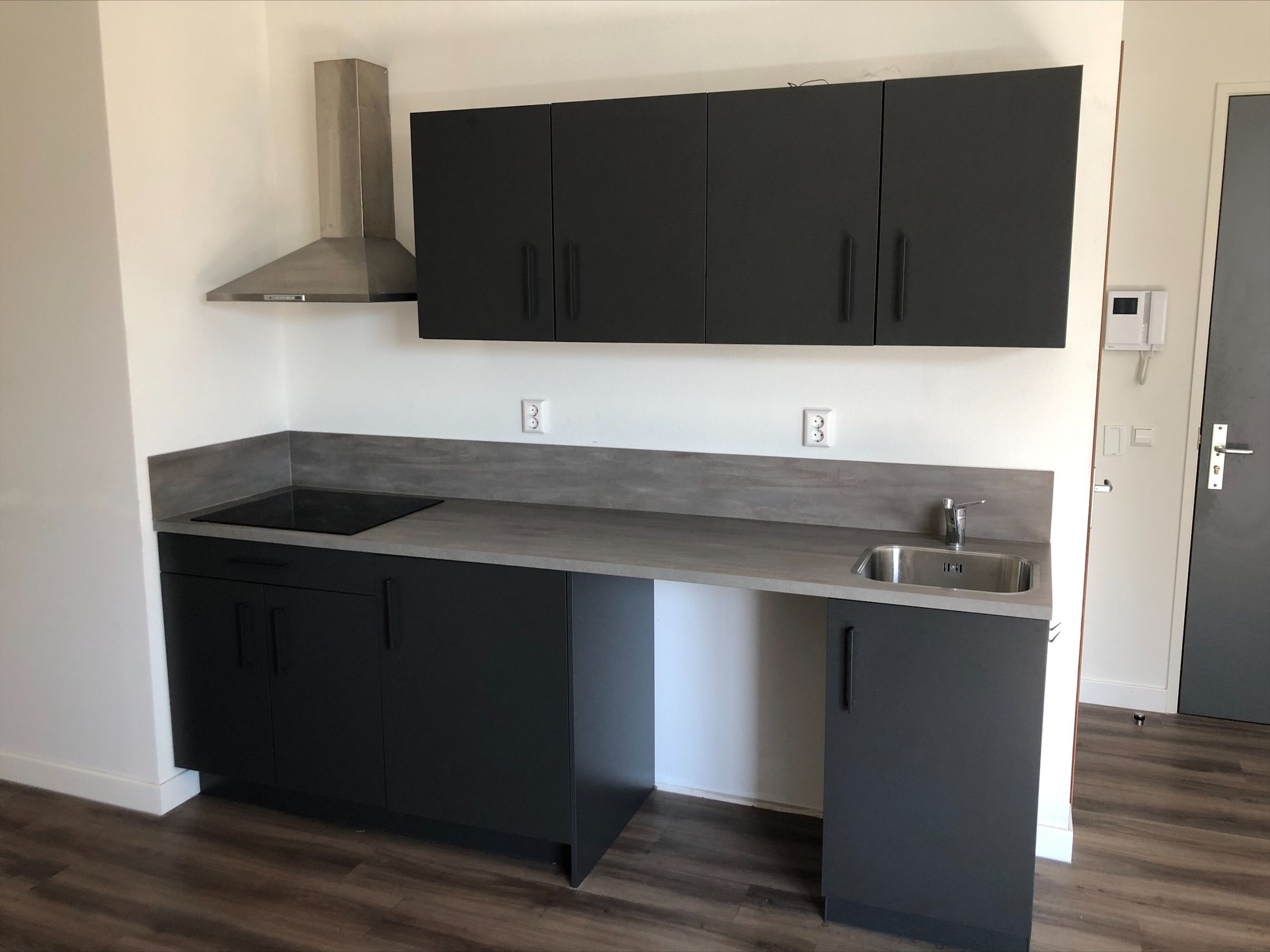 - Keuken in rechte met elektrische kookplaat, afzuigkap, combi-oven en koelkast met vriesvak