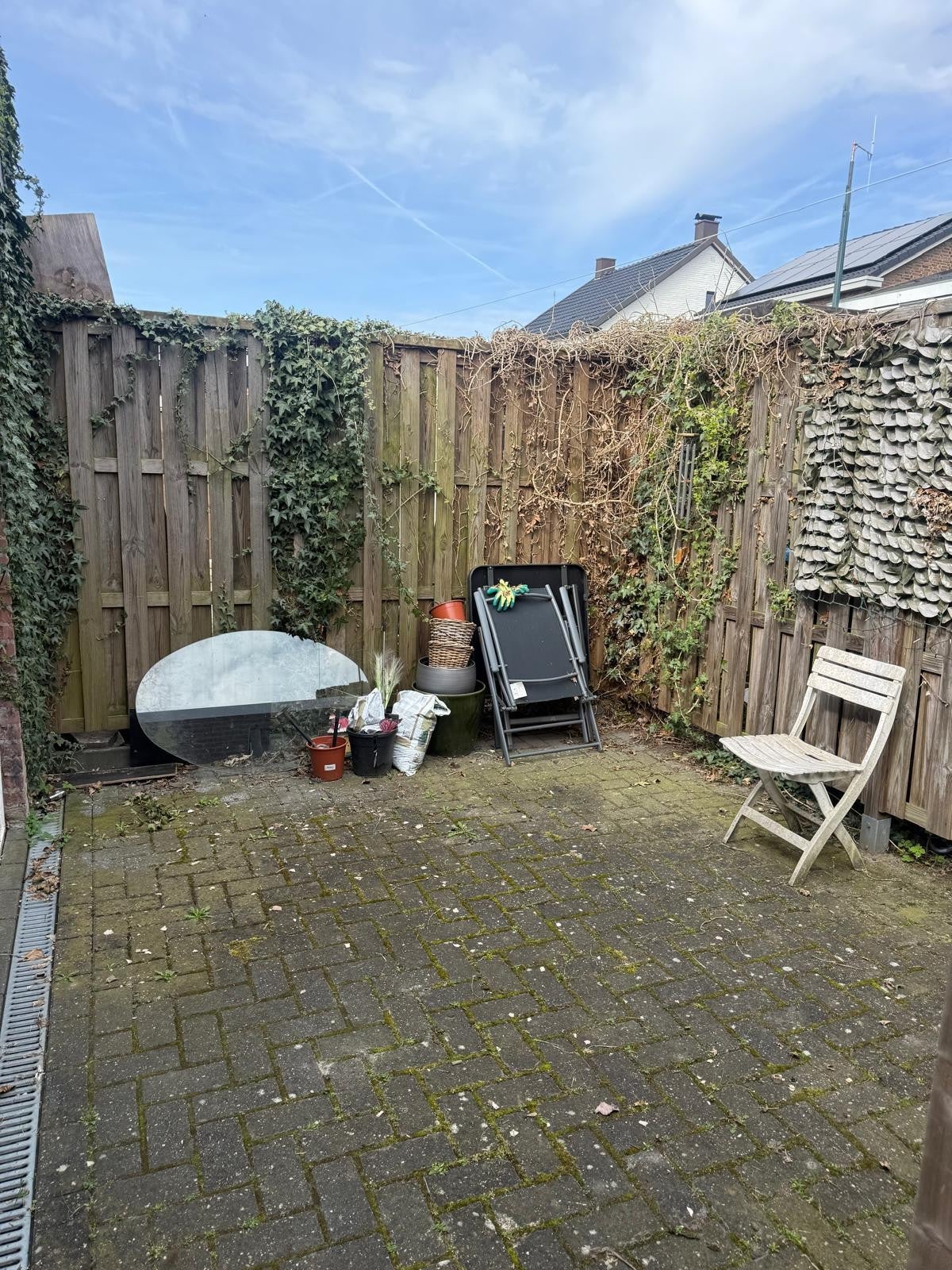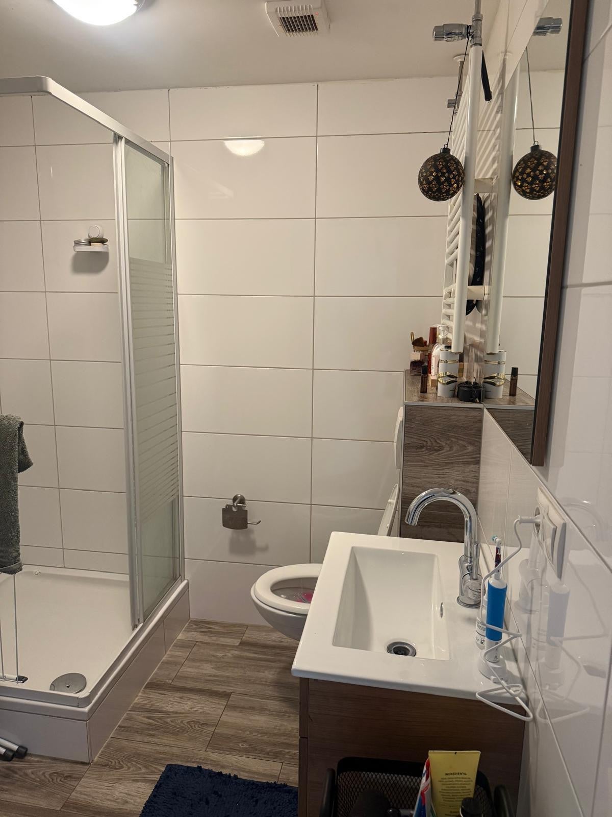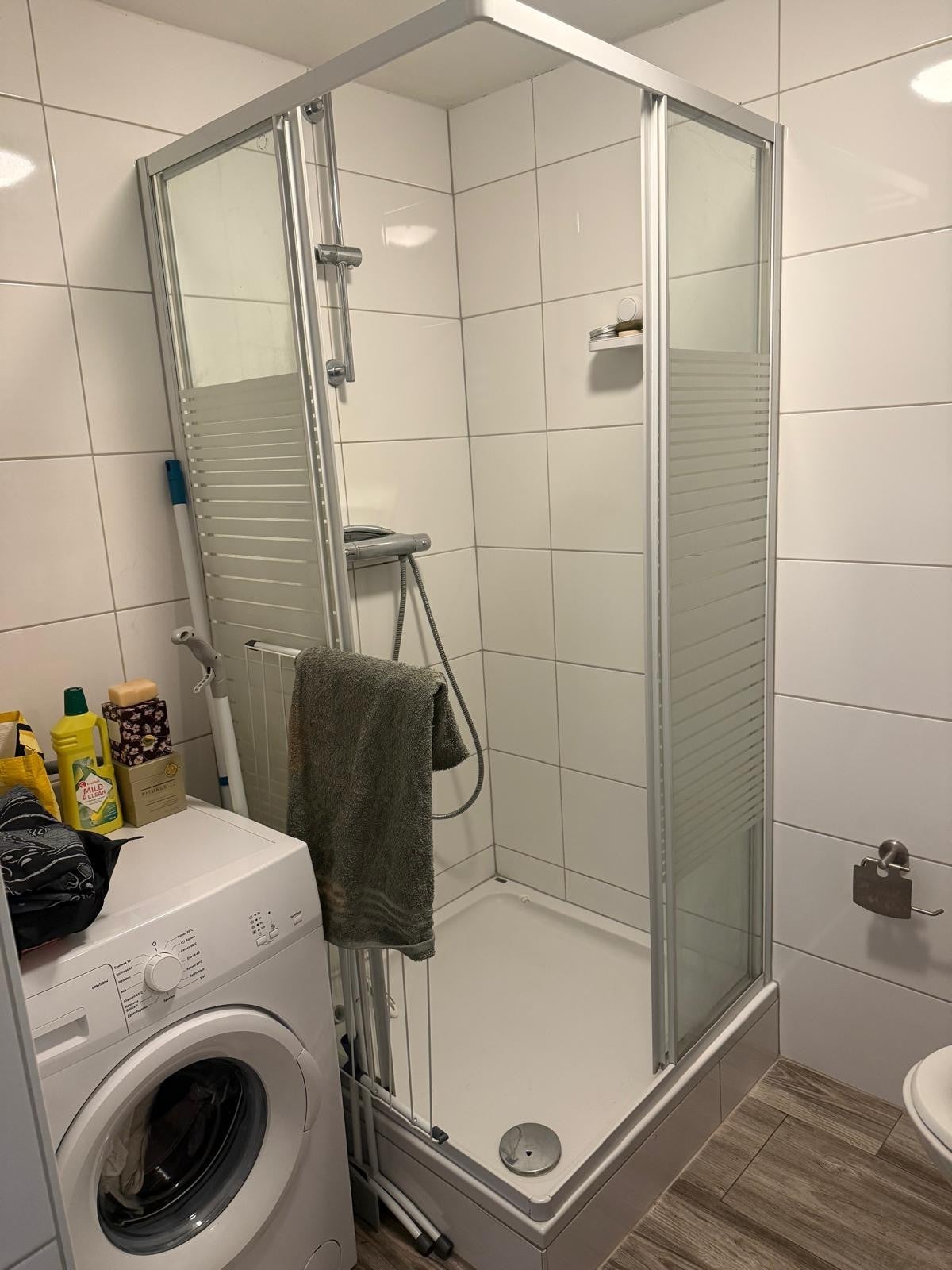 Mooie badkamer met douche, radiator, wastafel en wasmachine aansluiting. Studio beschikt over een kleine eigen tuin.